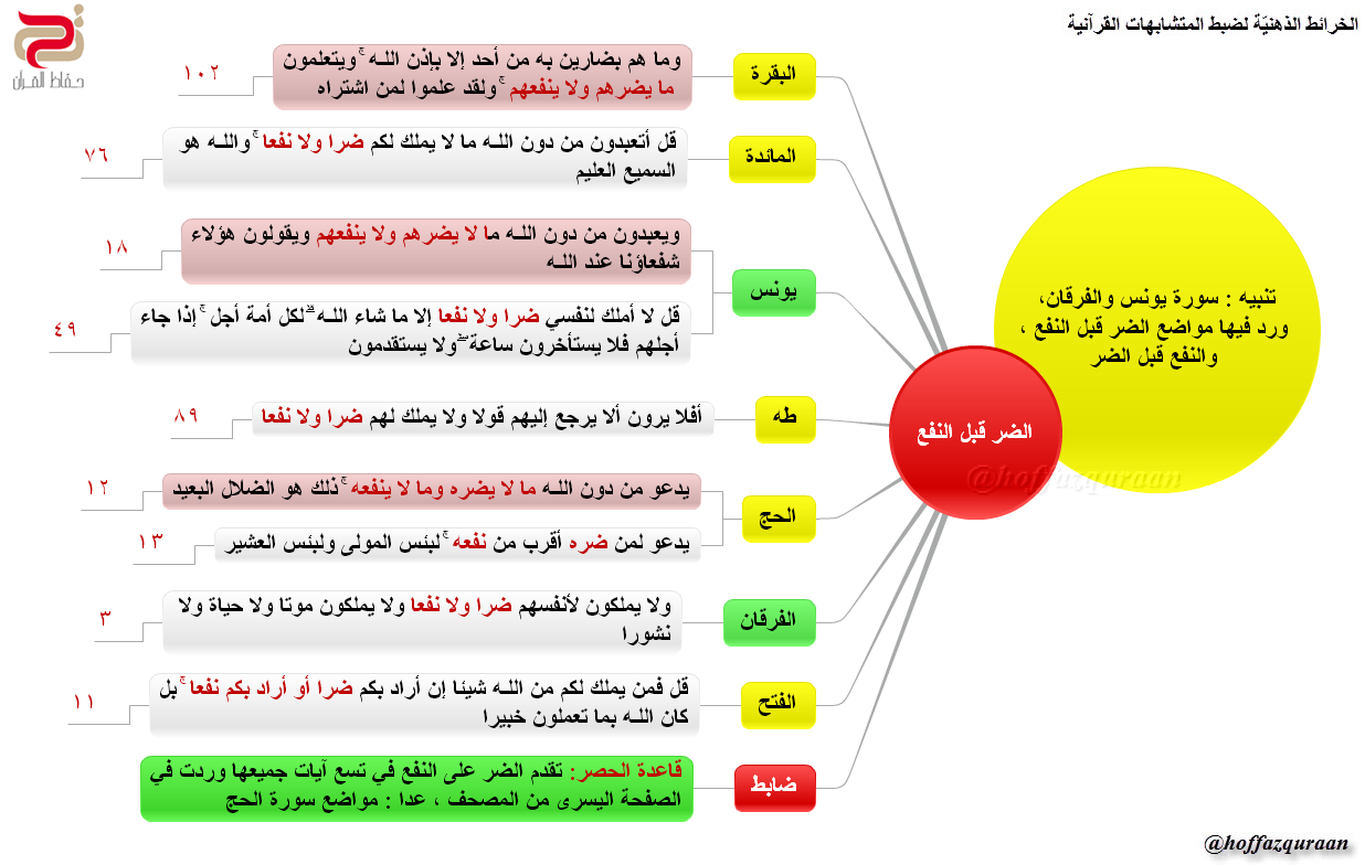 ▪ (الضابط): قاعدة (الحصر): تقدم الضر على النفع في تسع آيات جميعها وردت في الصفحة اليسرى من المصحف، عدا: مواضع سورة الحج.