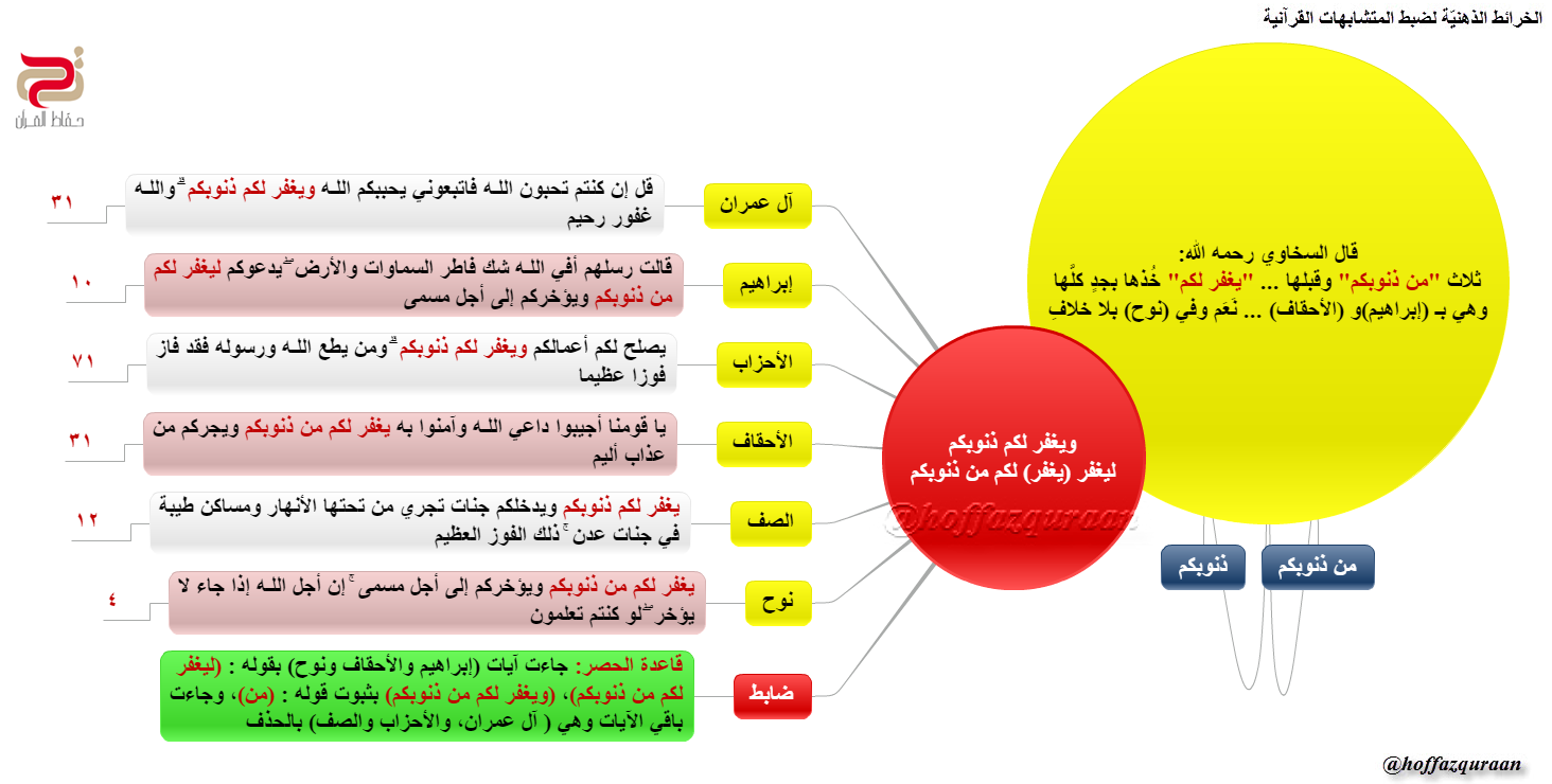 ▪ (الضابط): قاعدة (الحصر): جاءت آيات (إبراهيم، والأحقاف، ونوح) بقوله: (ليغفر لكم من ذنوبكم)، (ويغفر لكم من ذنوبكم) بثبوت قوله: (من)، وجاءت باقي الآيات وهي (آل عمران، والأحزاب، والصف) بالحذف.