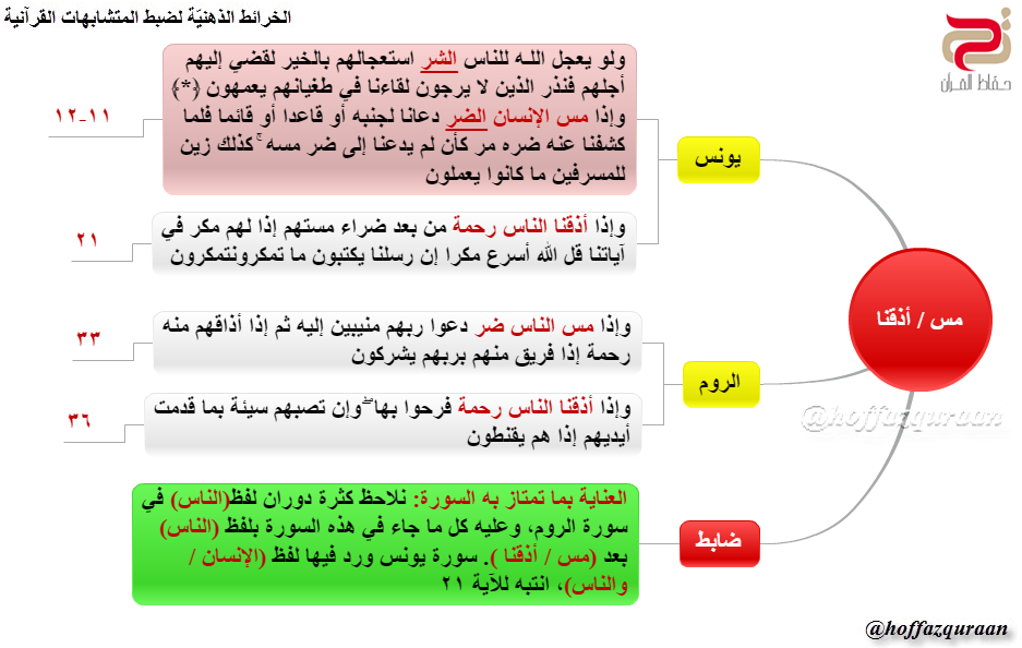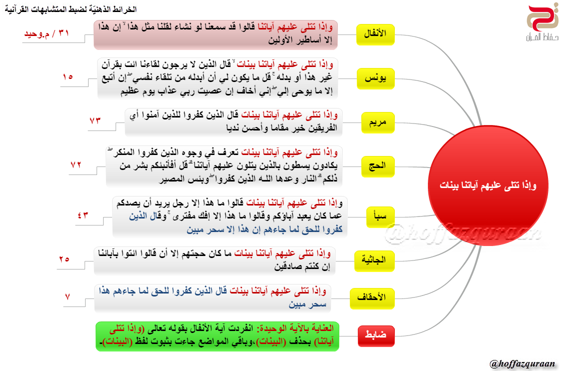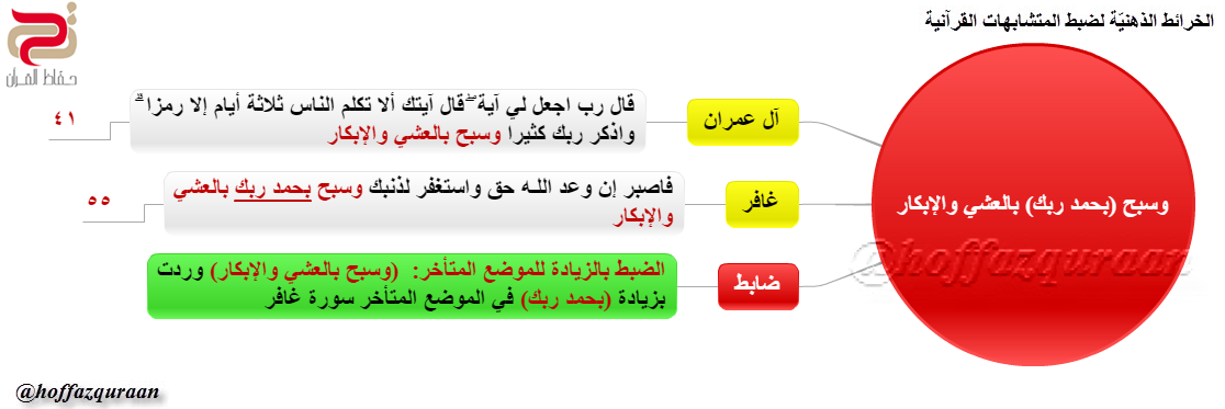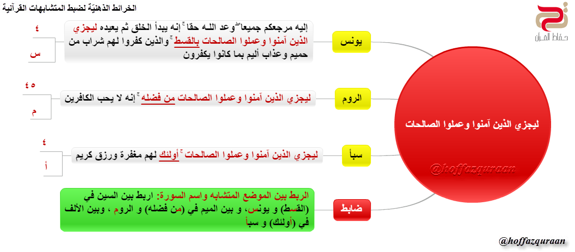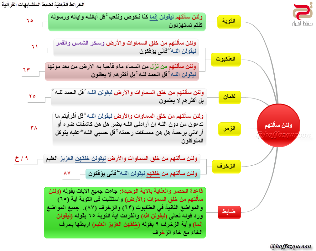 ▪ (الضابط): قاعدة (الحصر والعناية بالآية الوحيدة): جاءت جميع الآيات بقوله (ولئن سألتهم من خلق السموات والأرض) واستثنيت في التوبة آية (٦٥) والمواضع الثانية في العنكبوت (٦٣) والزخرف (۸۷). جميع المواضع ورد قوله تعالى (ليقولن الله) وانفردت آية التوبة (٦٥) بقوله (ليقولن إنما) وآية الزخرف (۹) بقوله: ﴿لَيَقُولُنَّ (خَـ)ـلَقَهُنَّ الْعَزِيزُ الْعَلِيمُ﴾ اربطها بحرف الخاء مع خاء الز(خـ)ـرف.