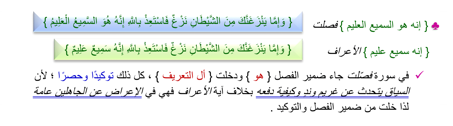 - في سورة فصّلت : جاء ضمير الفصل ( هو ) ودخلت ( أل التعريف ) ، كل ذلك توكيداً وحصراً ؛ لأن السياق يتحدث عن غريم وندٍ وكيفية دفعه بخلاف آية الأعراف : فهي في الإعراض عن الجاهلين عامة لذا خلت من ضمير الفصل والتوكيد .