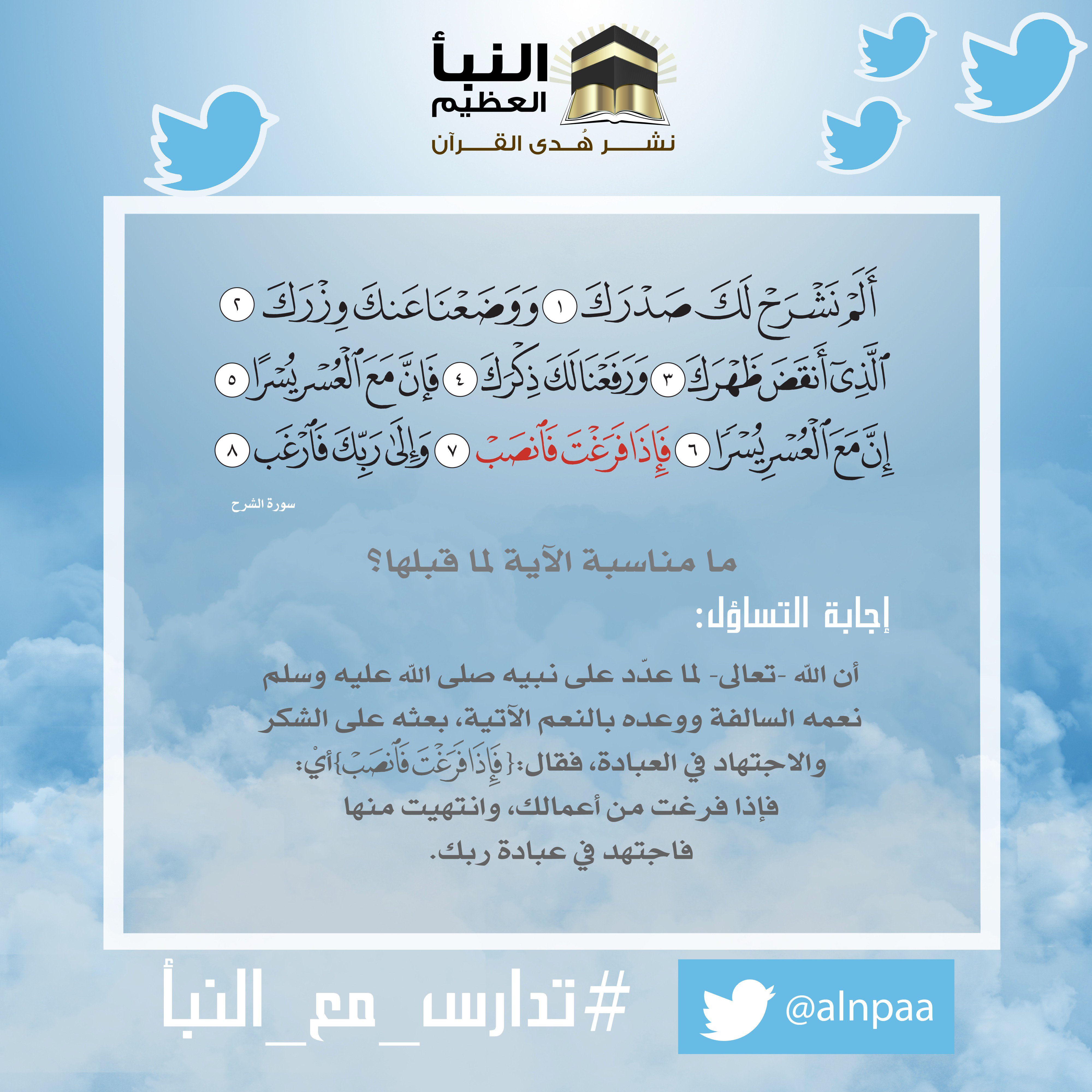 • إجابة التساؤل: أن الله - تعالى - لما عدّد على نبيه صلى الله عليه وسلم نعمه السالفة ووعده بالنعم الآتية، بعثه على الشكر والاجتهاد في العبادة، فقال: {فَإِذَا فَرَغْتَ فَانصَبْ} أي: فإذا فرغت من أعمالك، وانتهيت منها فاجتهد في عبادة ربك.