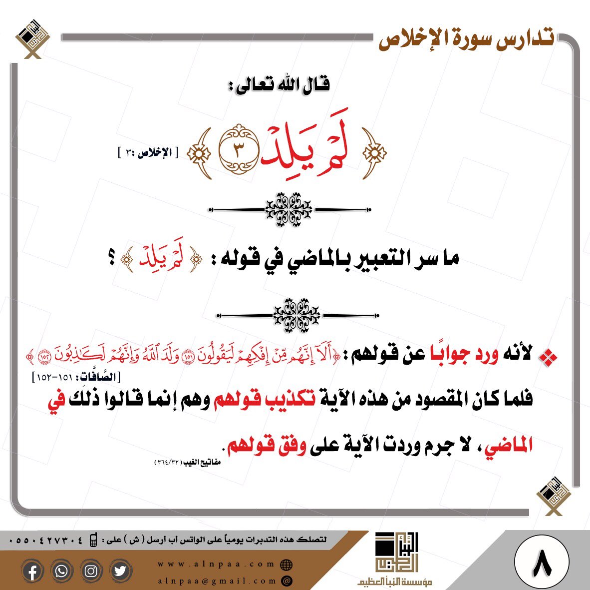 • التساؤل: قال تعالى: ﴿لَمْ يَلِدْ وَلَمْ يُولَدْ﴾ ما سر التعبير بالماضي في قوله: (لَمْ يَلِدْ)؟
