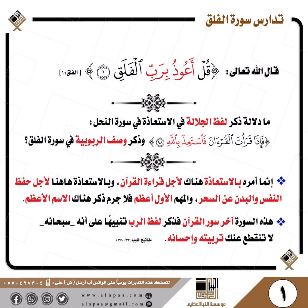 • التساؤل: قال تعالى: ﴿قُلْ أَعُوذُ بِرَبِّ الْفَلَقِ﴾ ما دلالة ذكر لفظ الجلالة في الاستعاذة في سورة النحل: ﴿فَإِذَا قَرَأْتَ الْقُرْآنَ فَاسْتَعِذْ بِاللَّهِ مِنَ الشَّيْطَانِ الرَّجِيمِ﴾ وذكر وصف الربوبية في سورة الفلق؟