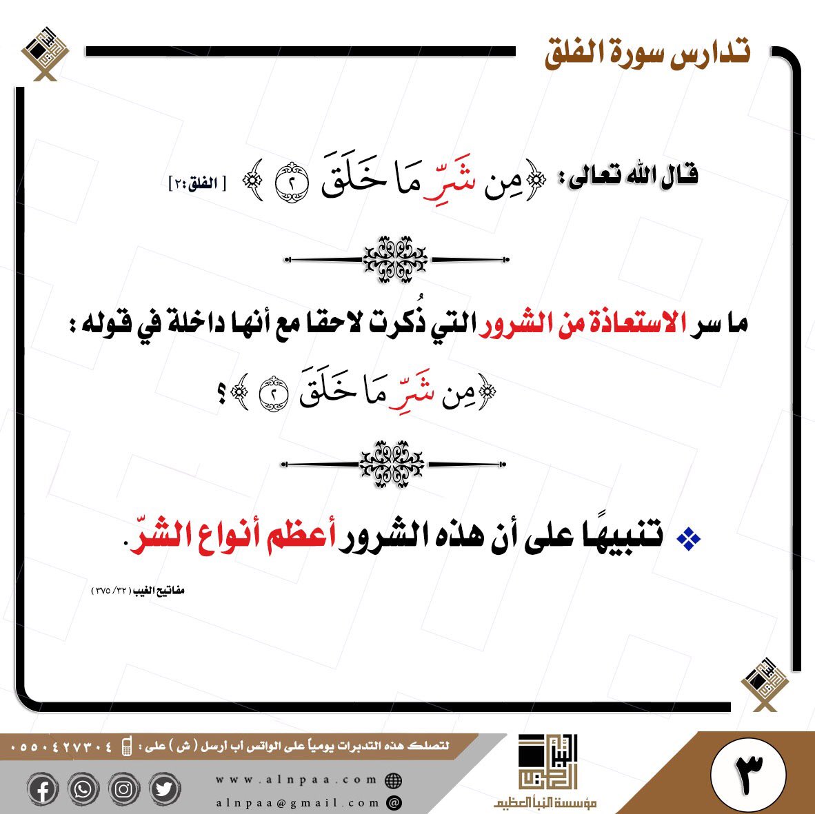 • التساؤل: قال تعالى: ﴿مِن شَرِّ مَا خَلَقَ﴾ ما سر الاستعاذة من الشرور التي ذُكرت لاحقا مع أنها داخلة في قوله: (مِن شَرِّ مَا خَلَقَ)؟