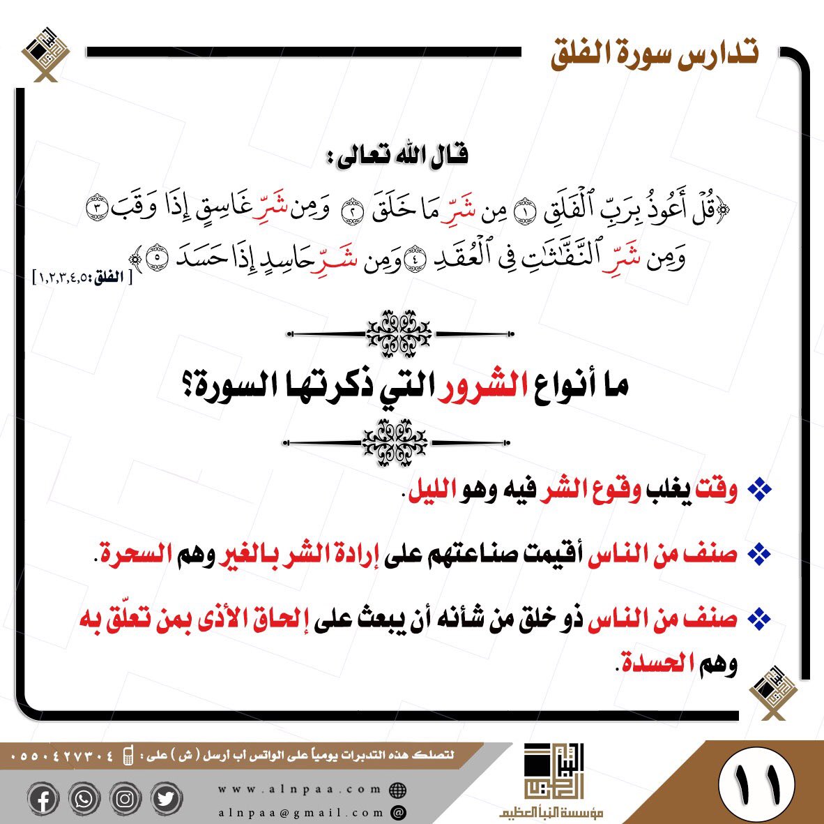 • التساؤل: قال تعالى: ﴿قُلْ أَعُوذُ بِرَبِّ الْفَلَقِ • مِن شَرِّ مَا خَلَقَ • وَمِن شَرِّ غَاسِقٍ إِذَا وَقَبَ • وَمِن شَرِّ النَّفَّاثَاتِ فِي الْعُقَدِ • وَمِن شَرِّ حَاسِدٍ إِذَا حَسَدَ﴾ ما أنواع الشرور التي ذكرتها السورة؟