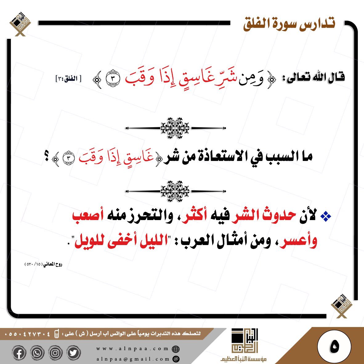 • التساؤل: قال الله تعالى: ﴿وَمِن شَرِّ غَاسِقٍ إِذَا وَقَبَ﴾ ما السبب في الاستعاذة من شر (غَاسِقٍ إِذَا وَقَبَ)؟