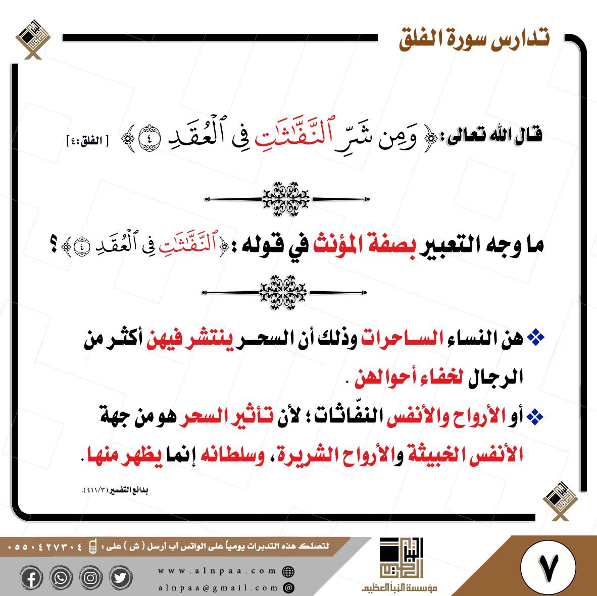 • التساؤل: قال الله تعالى: ﴿وَمِن شَرِّ النَّفَّاثَاتِ فِي الْعُقَدِ﴾ ما وجه التعبير بصفة المؤنث في قوله: (النَّفَّاثَاتِ فِي الْعُقَدِ)؟