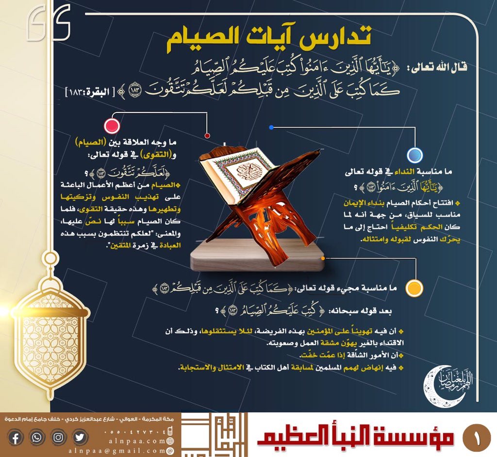 • التساؤل: ما وجه العلاقة بين (الصيام)، و(التقوى) في قوله تعالى: (لَعَلَّكُمْ تَتَّقُونَ)؟