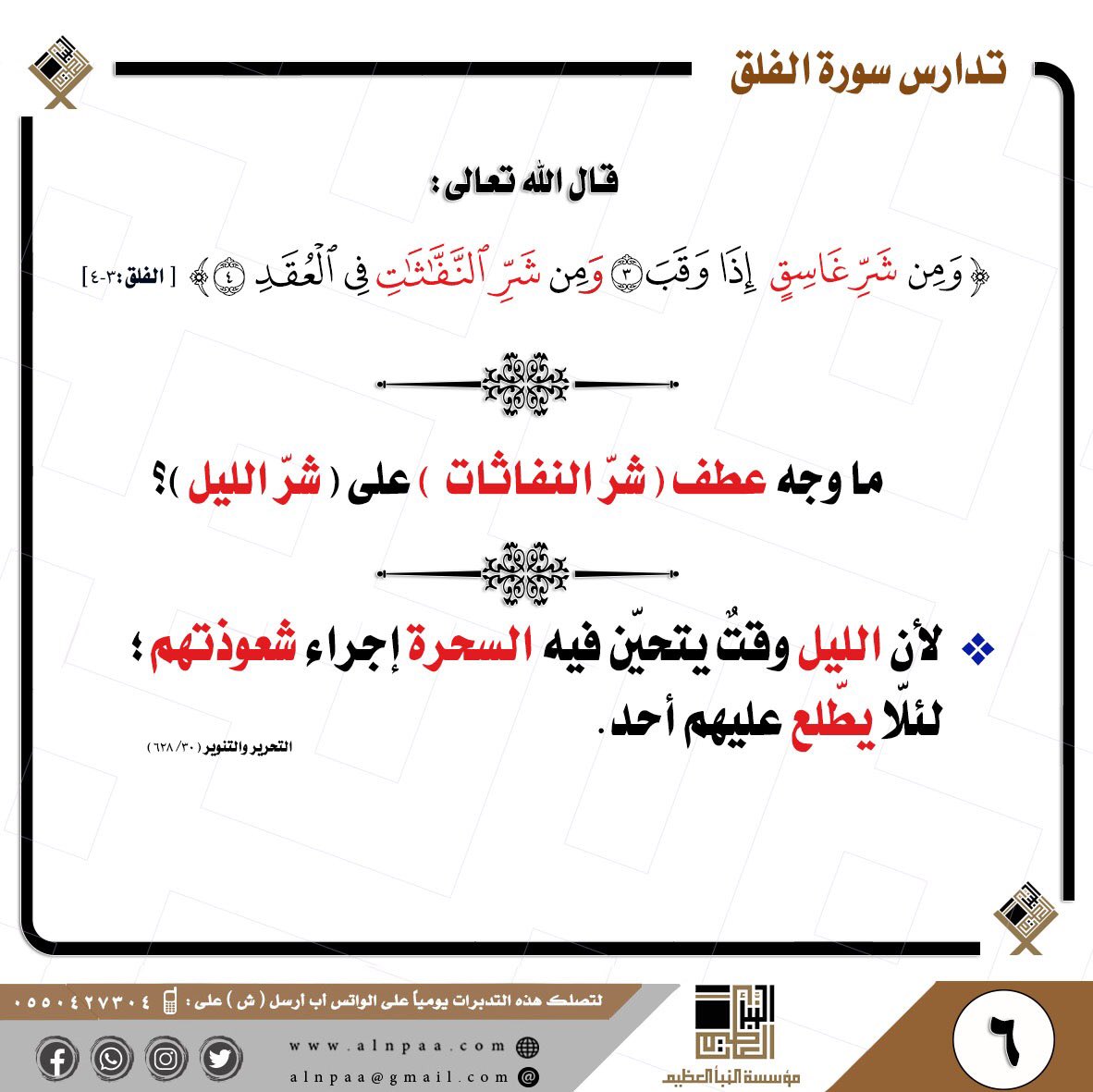 • التساؤل: قال الله تعالى: ﴿وَمِن شَرِّ غَاسِقٍ إِذَا وَقَبَ • وَمِن شَرِّ النَّفَّاثَاتِ فِي الْعُقَدِ﴾ ما وجه عطف (شَرِّ النَّفَّاثَاتِ) على (شرّ الليل)؟
