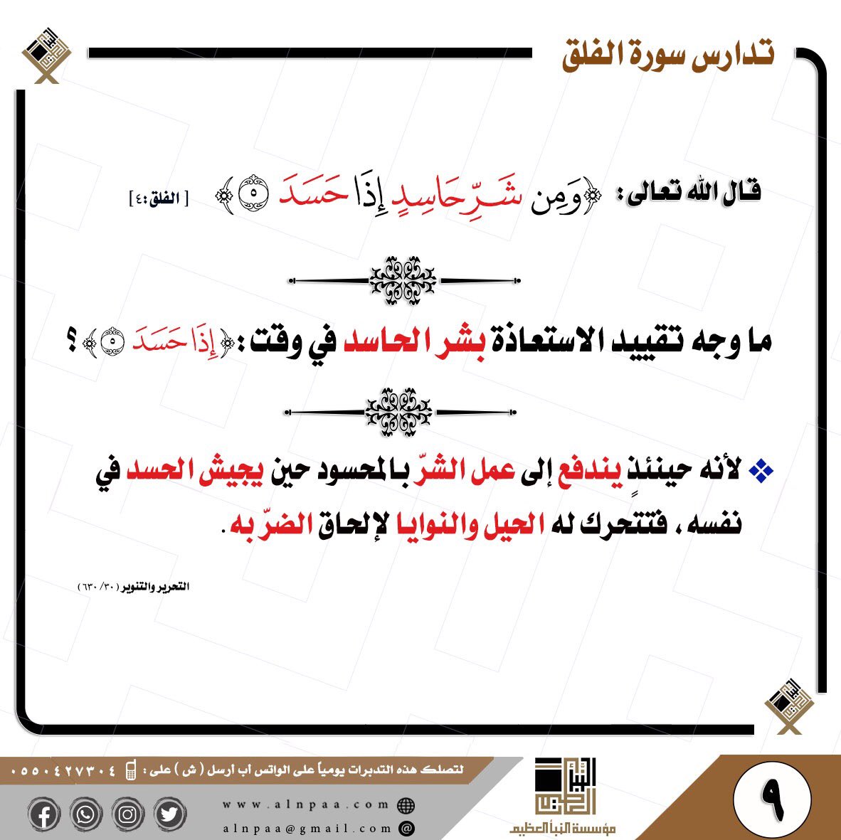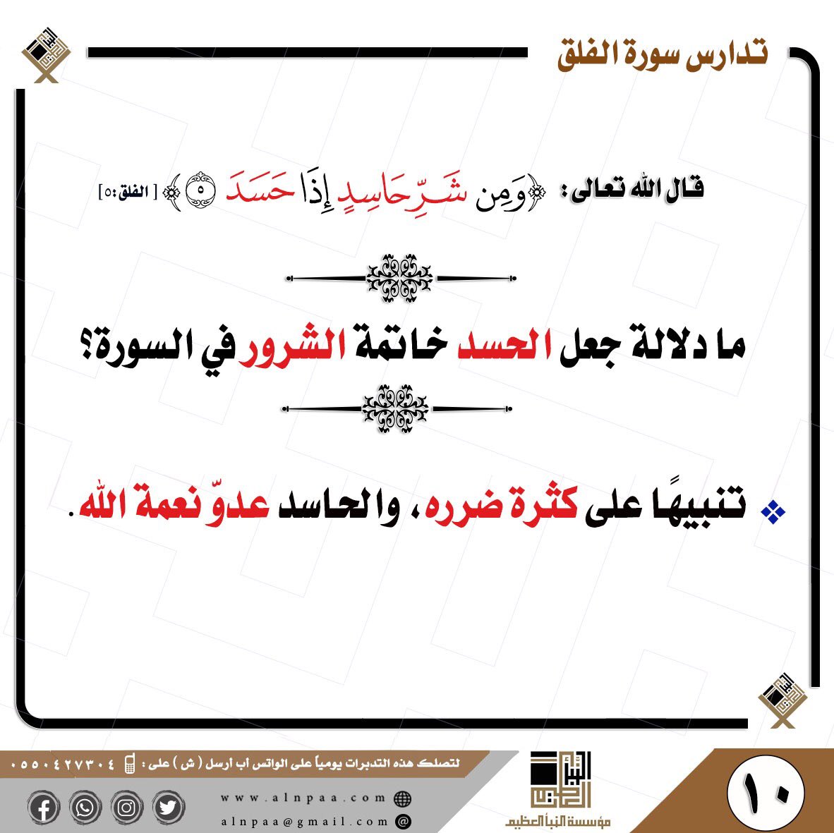 • التساؤل: قال الله تعالى: ﴿وَمِن شَرِّ حَاسِدٍ إِذَا حَسَدَ﴾ ما دلالة جعل الحسد خاتمة الشرور في السورة؟