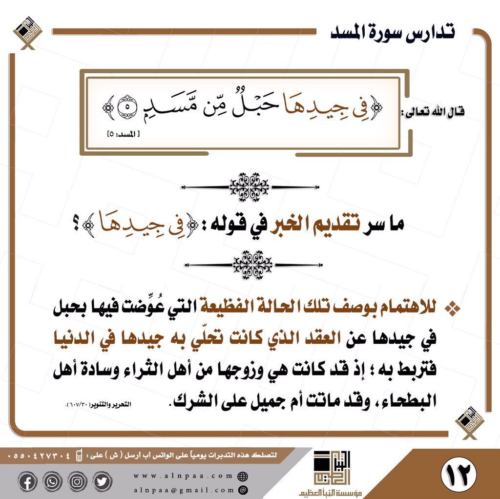 • التساؤل: قال الله تعالى: ﴿فِي جِيدِهَا حَبْلٌ مِّن مَّسَدٍ﴾ ما سر تقديم الخبر في قوله: (فِي جِيدِهَا)؟