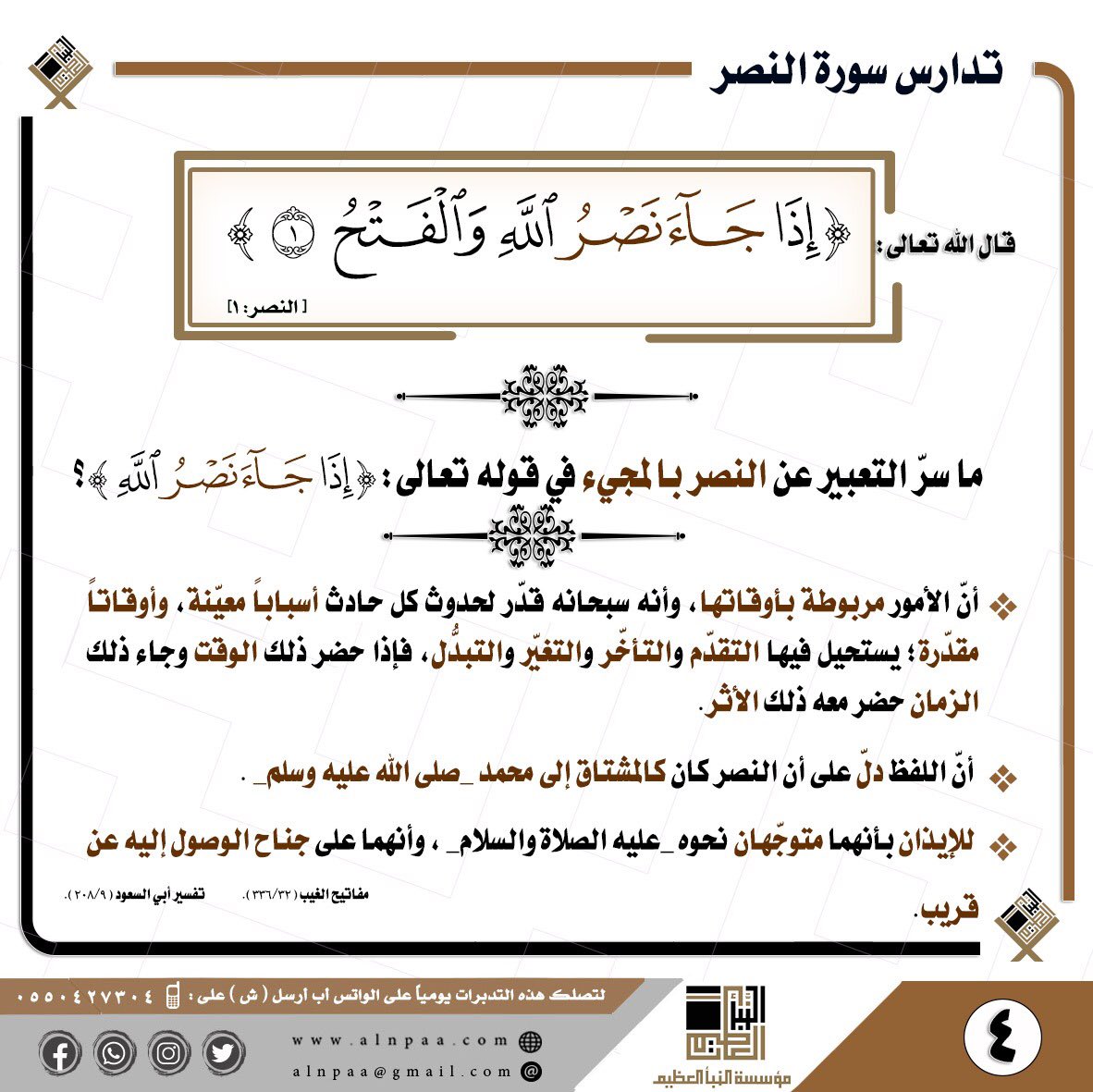• التساؤل: قال الله تعالى: ﴿إِذَا جَاءَ نَصْرُ اللَّهِ وَالْفَتْحُ﴾ ما سرّ التعبير عن النصر بالمجيء في قوله تعالى: (إِذَا جَاءَ نَصْرُ اللَّهِ وَالْفَتْحُ)؟