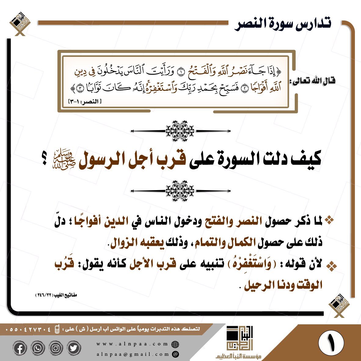 • التساؤل: قال الله تعالى: ﴿إِذَا جَاءَ نَصْرُ اللَّهِ وَالْفَتْحُ • وَرَأَيْتَ النَّاسَ يَدْخُلُونَ فِي دِينِ اللَّهِ أَفْوَاجًا • فَسَبِّحْ بِحَمْدِ رَبِّكَ وَاسْتَغْفِرْهُ إِنَّهُ كَانَ تَوَّابًا﴾ كيف دلت السورة على قرب أجل الرسول (ﷺ)؟