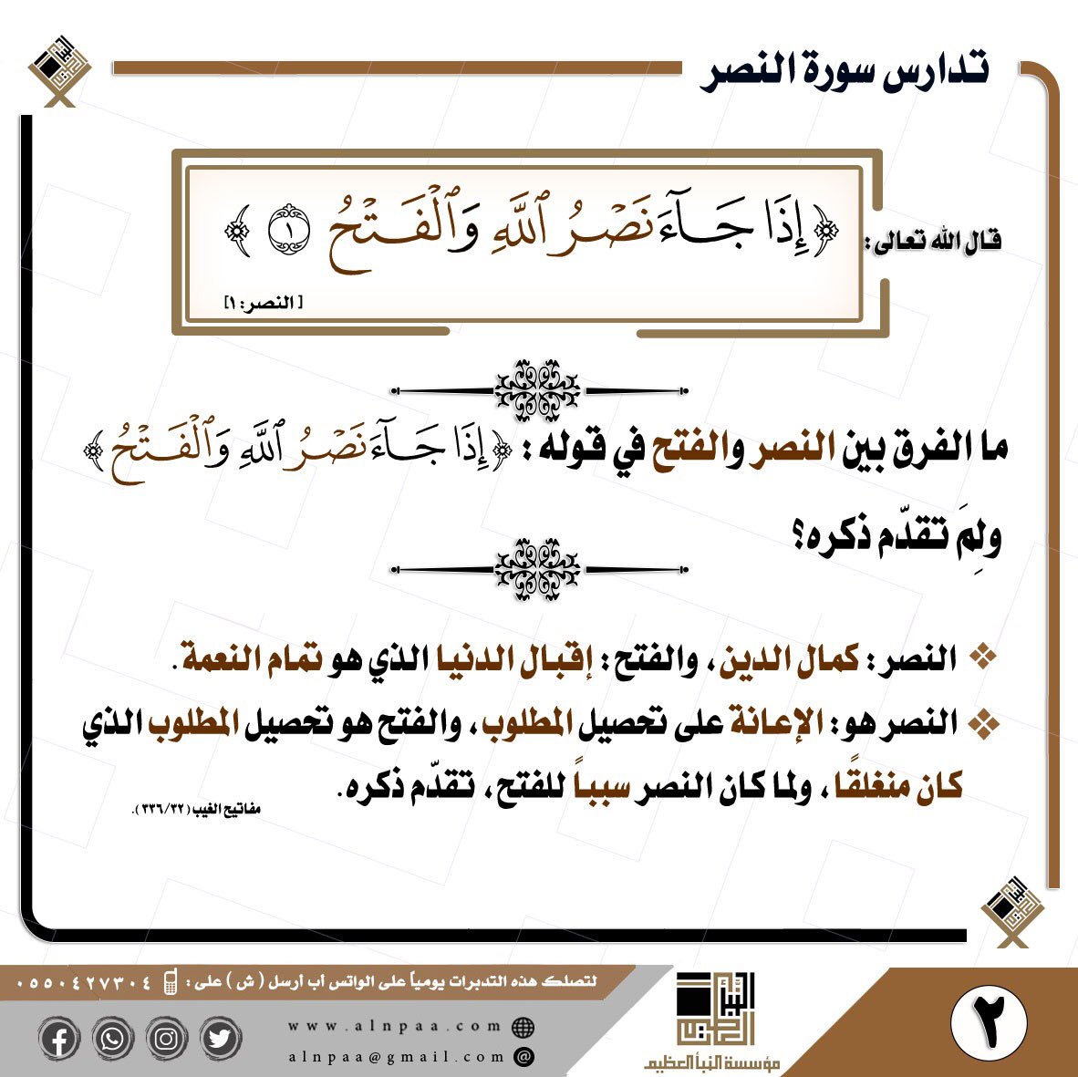 • التساؤل: قال الله تعالى: ﴿إِذَا جَاءَ نَصْرُ اللَّهِ وَالْفَتْحُ﴾ ما الفرق بين النصر والفتح في قوله: (إِذَا جَاءَ نَصْرُ اللَّهِ وَالْفَتْحُ) ولِمَ تقدّم ذكره؟