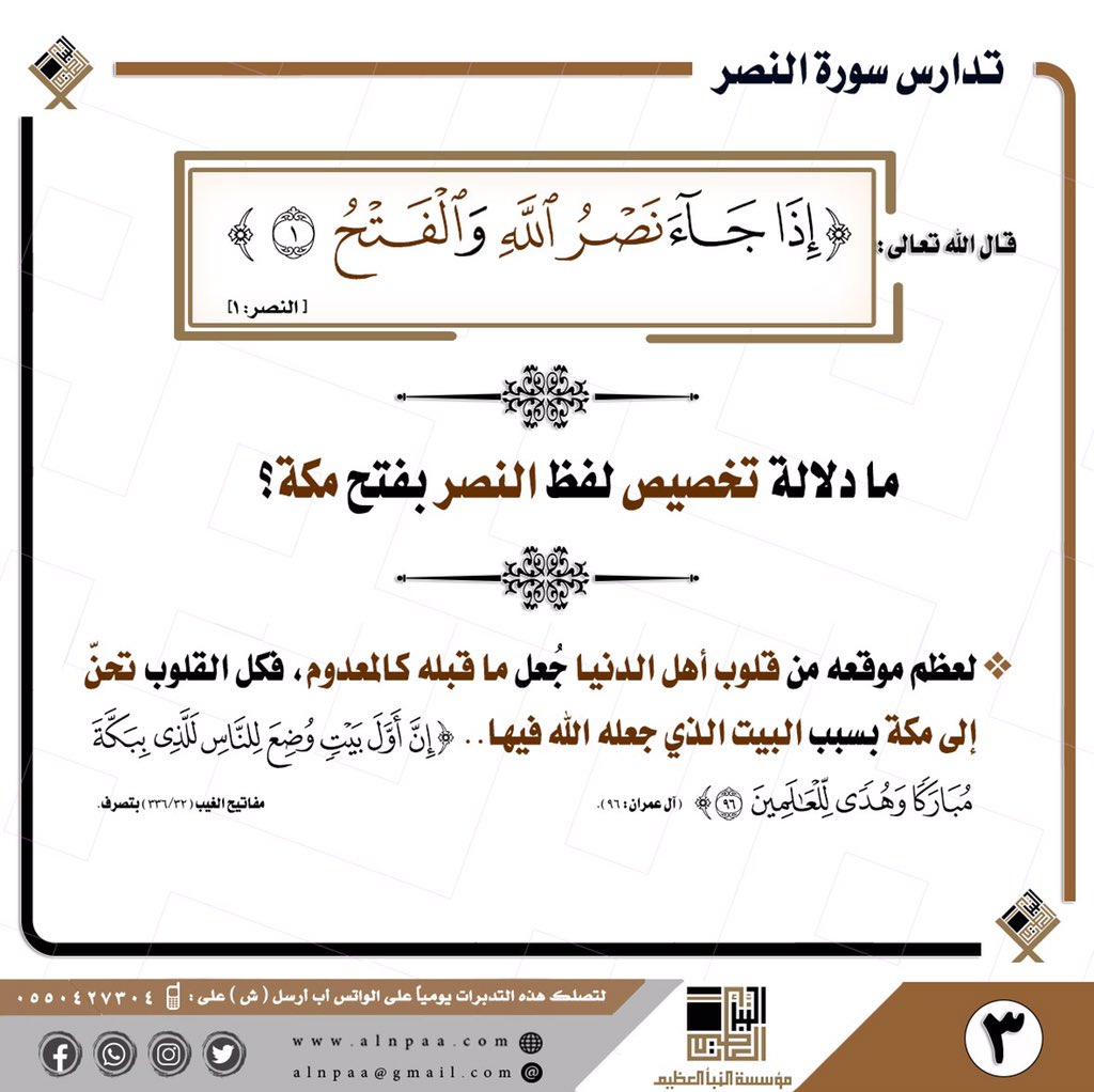 • التساؤل: قال الله تعالى: ﴿إِذَا جَاءَ نَصْرُ اللَّهِ وَالْفَتْحُ﴾ ما دلالة تخصيص لفظ النصر بفتح مكة؟