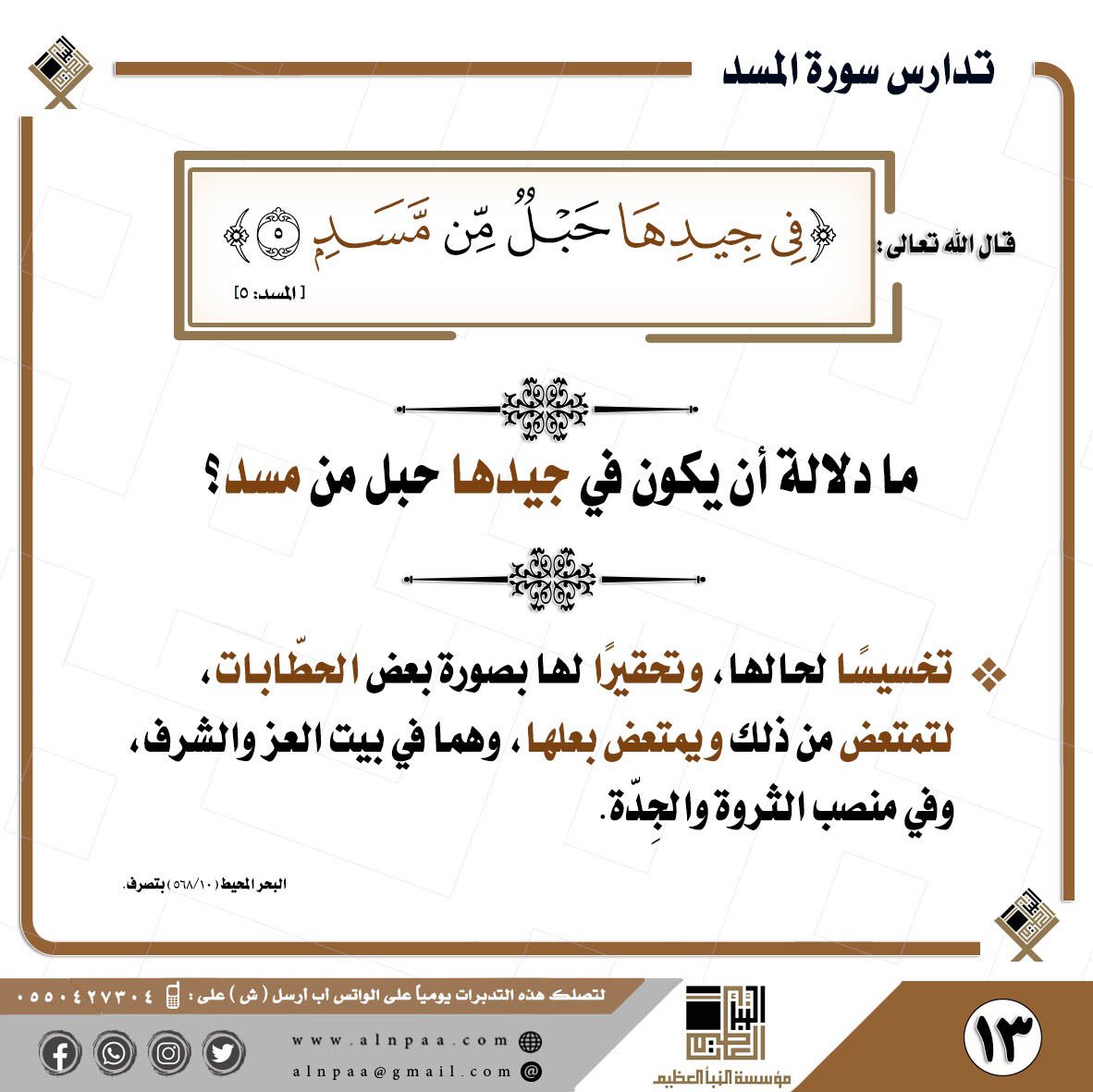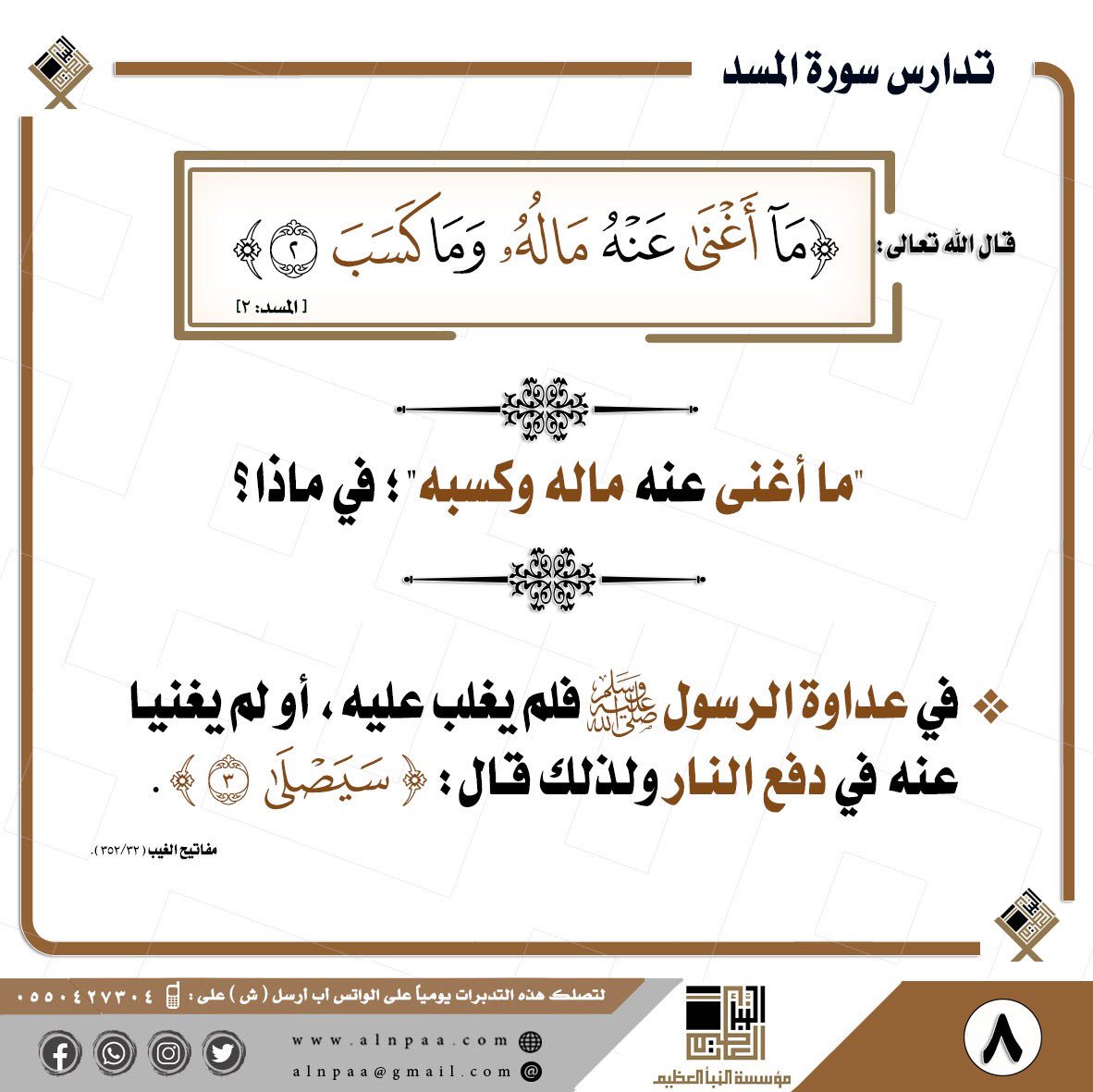 • التساؤل: قال الله تعالى: ﴿مَا أَغْنَى عَنْهُ مَالُهُ وَمَا كَسَبَ﴾ "ما أغنى عنه ماله وكسبه"؛ في ماذا؟