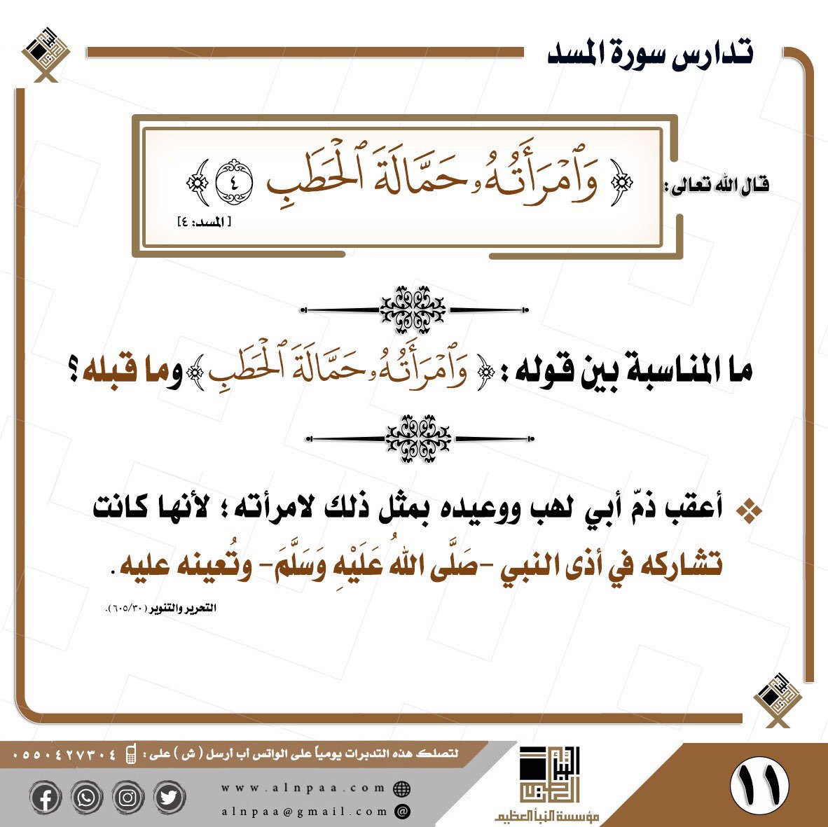 • التساؤل: قال الله تعالى: ﴿وَامْرَأَتُهُ حَمَّالَةَ الْحَطَبِ﴾ ما المناسبة بين قوله: (وَامْرَأَتُهُ حَمَّالَةَ الْحَطَبِ) وما قبله؟