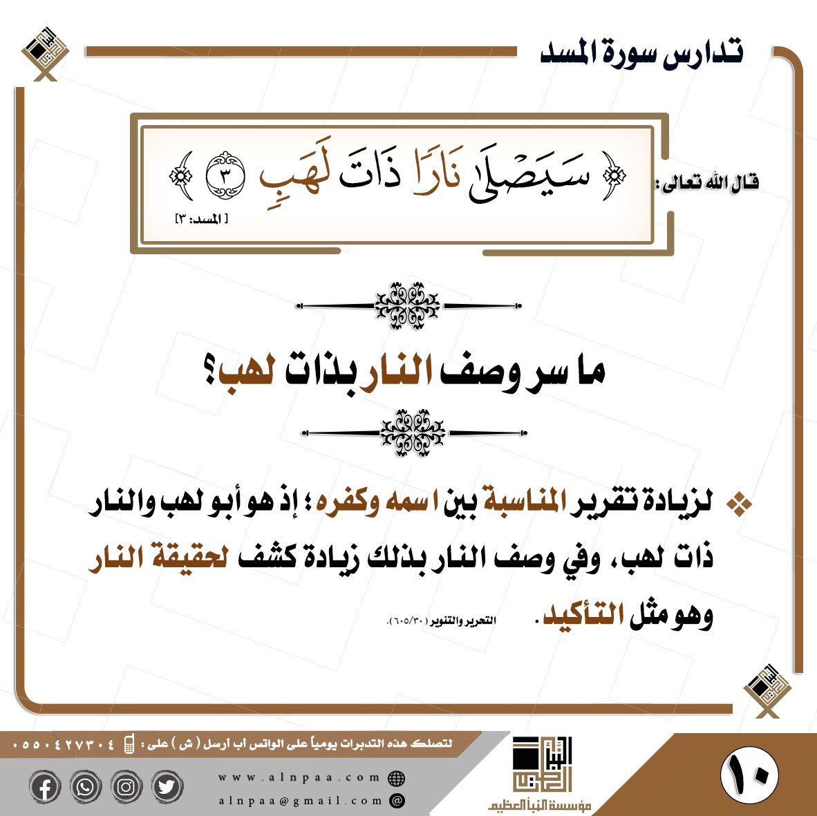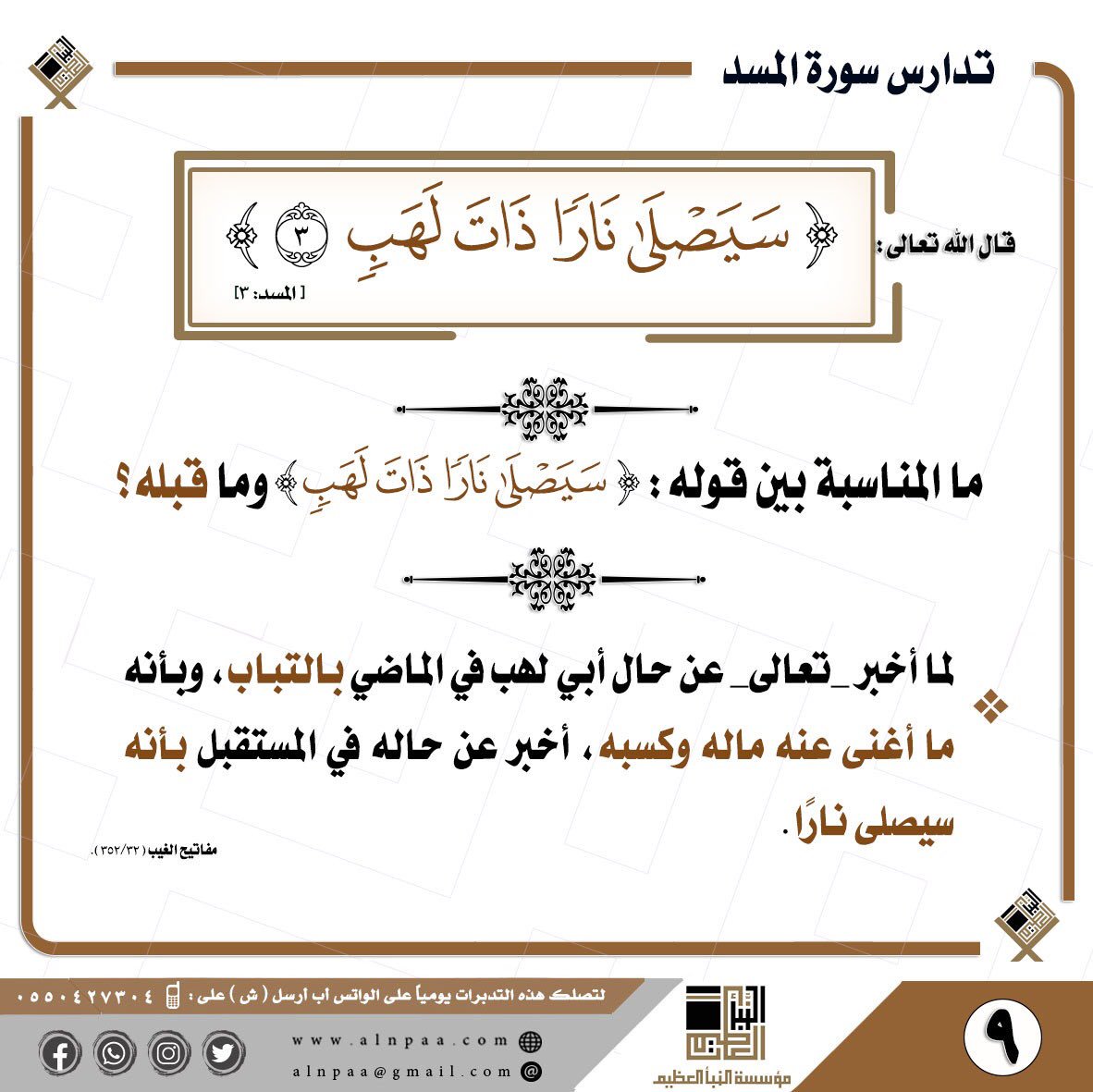 • التساؤل: قال الله تعالى: ﴿سَيَصْلَى نَارًا ذَاتَ لَهَبٍ﴾ ما المناسبة بين قوله: (سَيَصْلَى نَارًا ذَاتَ لَهَبٍ) وما قبله؟