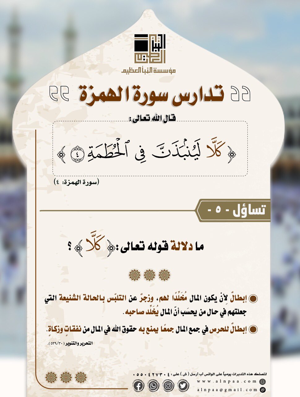 ▪️ التساؤل: قال الله تعالى: ﴿كَلَّا لَيُنبَذَنَّ فِي الْحُطَمَةِ﴾ ما دلالة قوله تعالى: (كَلَّا)؟