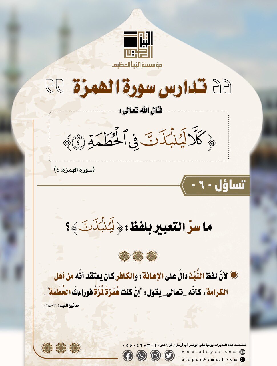 ▪️ التساؤل: قال الله تعالى: ﴿كَلَّا لَيُنبَذَنَّ فِي الْحُطَمَةِ﴾ ما سرّ التعبير بلفظ: (لَيُنبَذَنَّ)؟