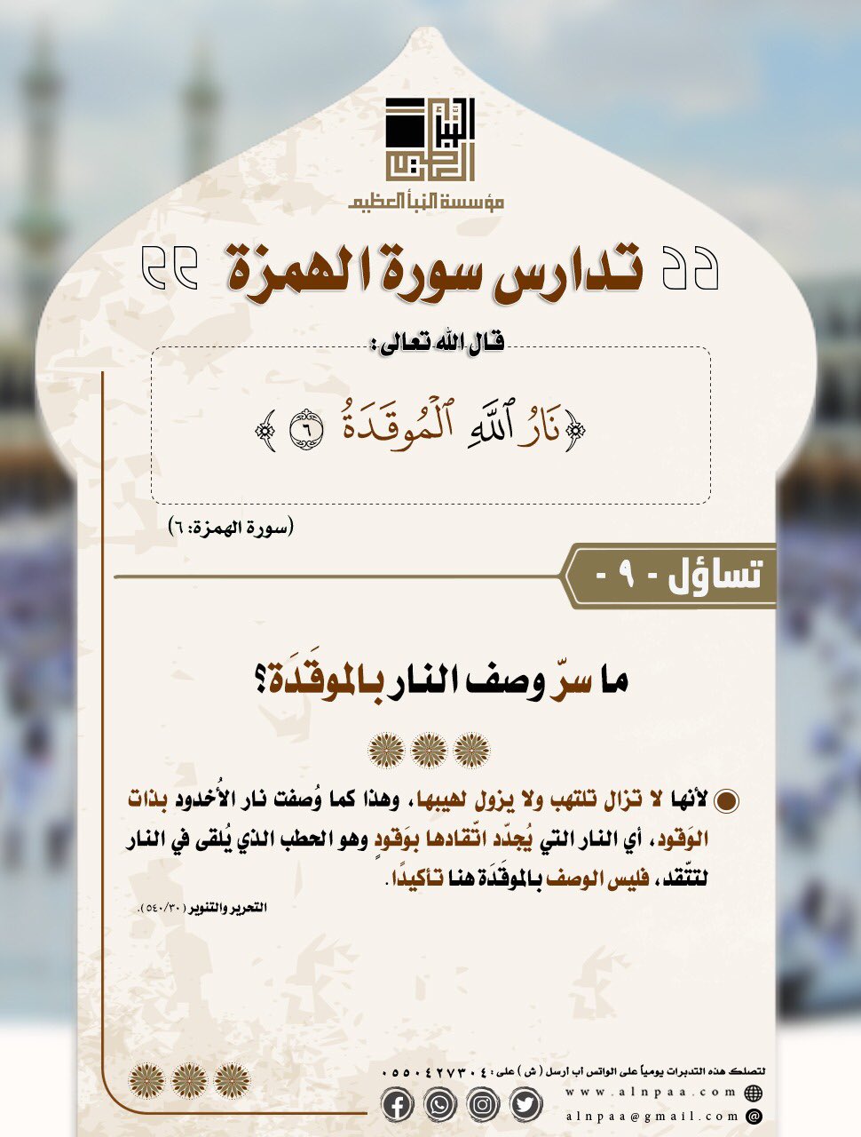 ▪️ التساؤل: قال الله تعالى: ﴿نَارُ اللَّهِ الْمُوقَدَةُ﴾ ما سرّ وصف النار بالموقَدَة؟