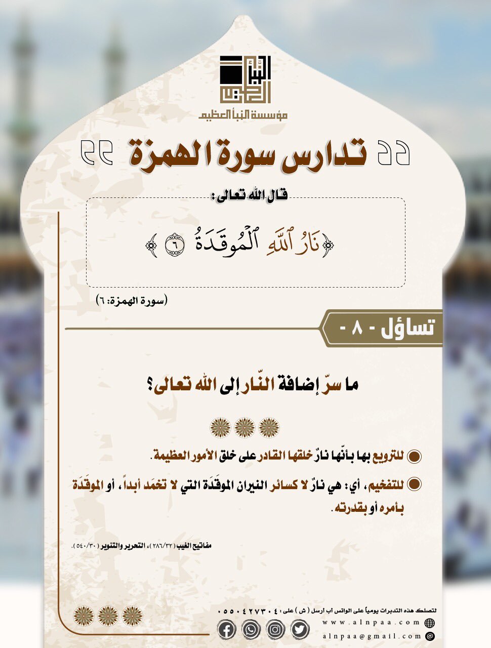 ▪️ التساؤل: قال الله تعالى: ﴿نَارُ اللَّهِ الْمُوقَدَةُ﴾ ما سرّ إضافة النّار إلى الله تعالى؟