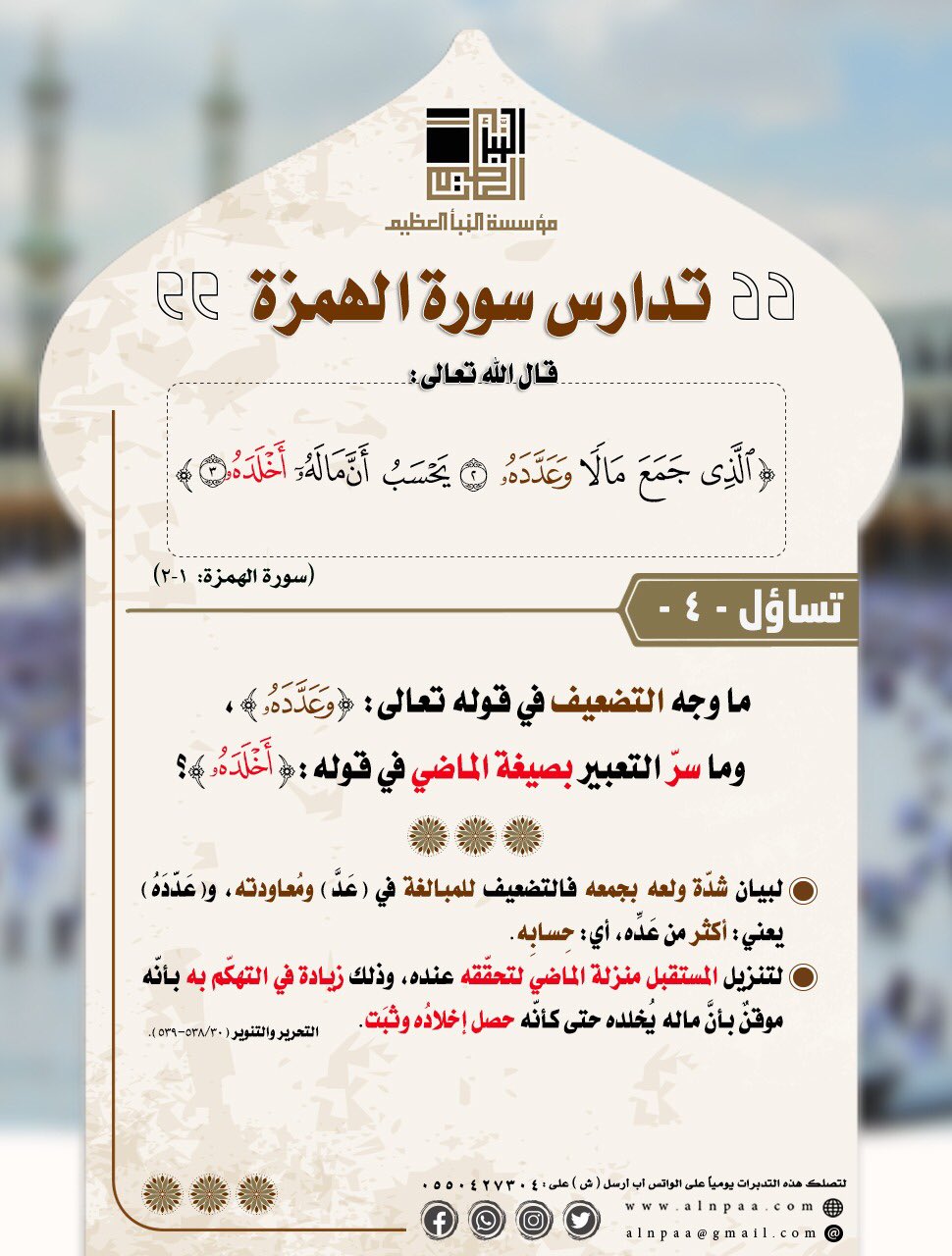 ▪️ التساؤل: قال الله تعالى: ﴿الَّذِي جَمَعَ مَالًا وَعَدَّدَهُ • يَحْسَبُ أَنَّ مَالَهُ أَخْلَدَهُ﴾ ما وجه التضعيف في قوله تعالى: (وَعَدَّدَهُ)، وما سر التعبير بصيغة الماضي في قوله: (أَخْلَدَهُ)؟