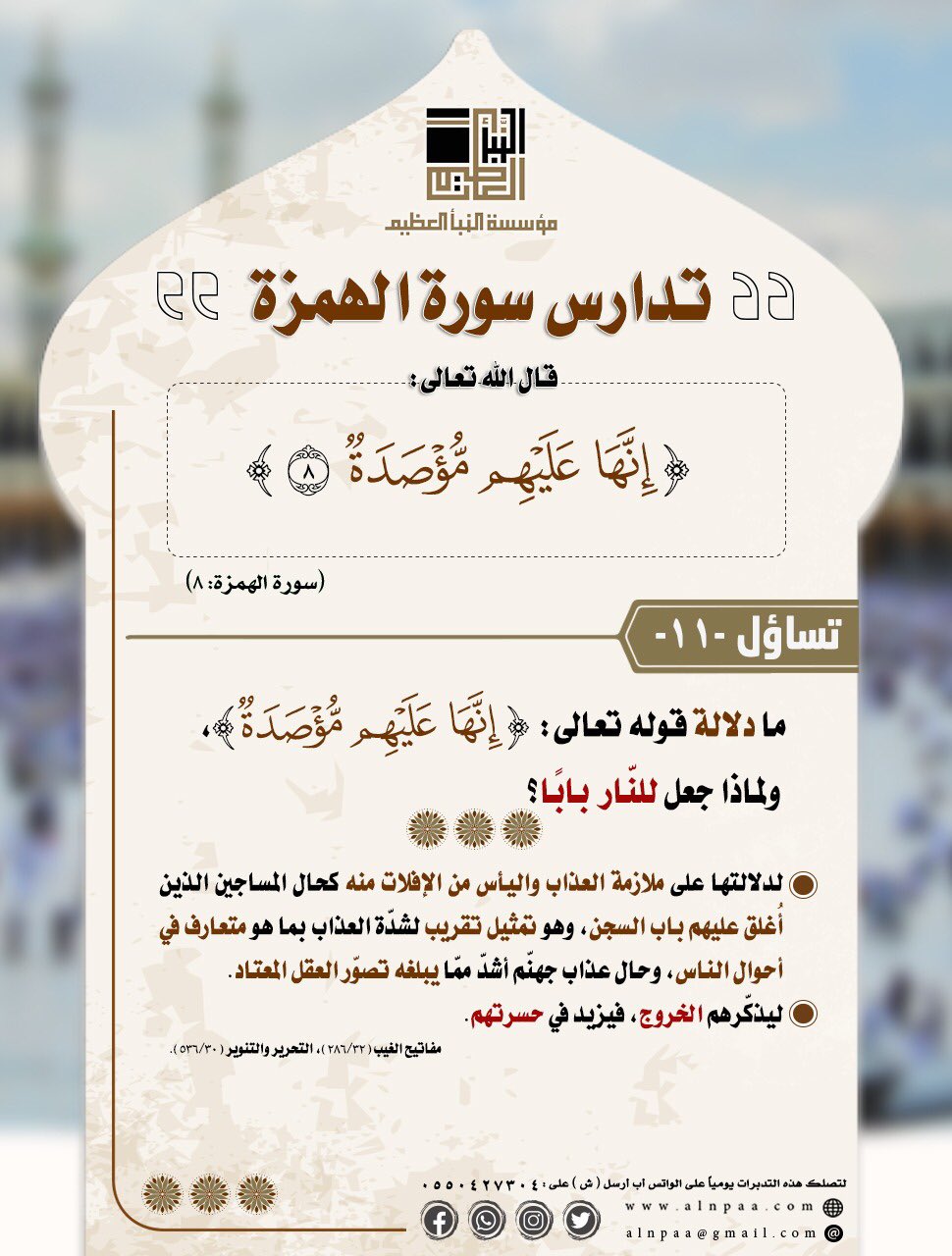 ▪️ التساؤل: قال الله تعالى: ﴿إِنَّهَا عَلَيْهِم مُّؤْصَدَةٌ﴾ ما دلالة قوله تعالى: (إِنَّهَا عَلَيْهِم مُّؤْصَدَةٌ) ولماذا جعل للنّار بابًا؟