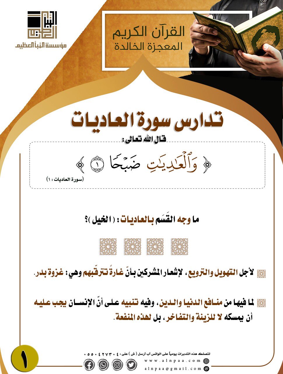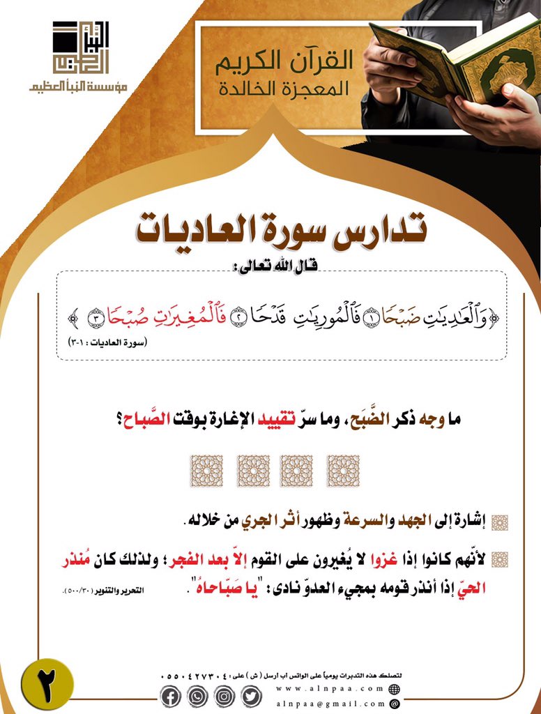 ▪️ التساؤل: قال الله تعالى: ﴿وَالْعَادِيَاتِ ضَبْحًا • فَالْمُورِيَاتِ قَدْحًا • فَالْمُغِيرَاتِ صُبْحًا﴾ ما وجه ذكر الضَّبَح، وما سرّ تقييد الإغارة بوقت الصَّباح؟