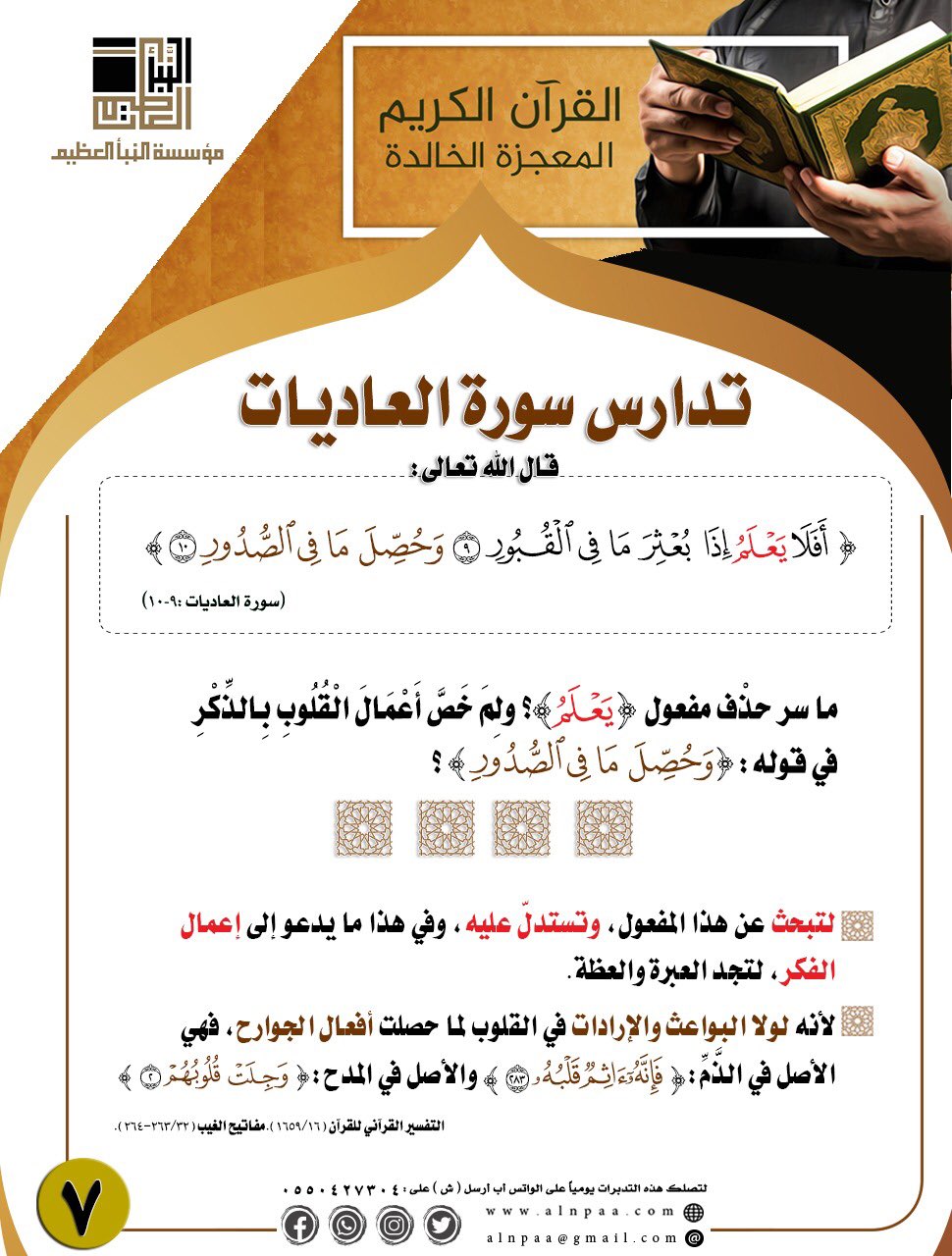 ▪️ التساؤل: قال الله تعالى: ﴿أَفَلَا يَعْلَمُ إِذَا بُعْثِرَ مَا فِي الْقُبُورِ • وَحُصِّلَ مَا فِي الصُّدُورِ﴾ ما سر حذف مفعول (يَعْلَمُ)؟ ولِمَ خَصَّ أَعْمَالَ الْقُلُوبِ بِالذِّكْرِ في قوله: (وَحُصِّلَ مَا فِي الصُّدُورِ)؟