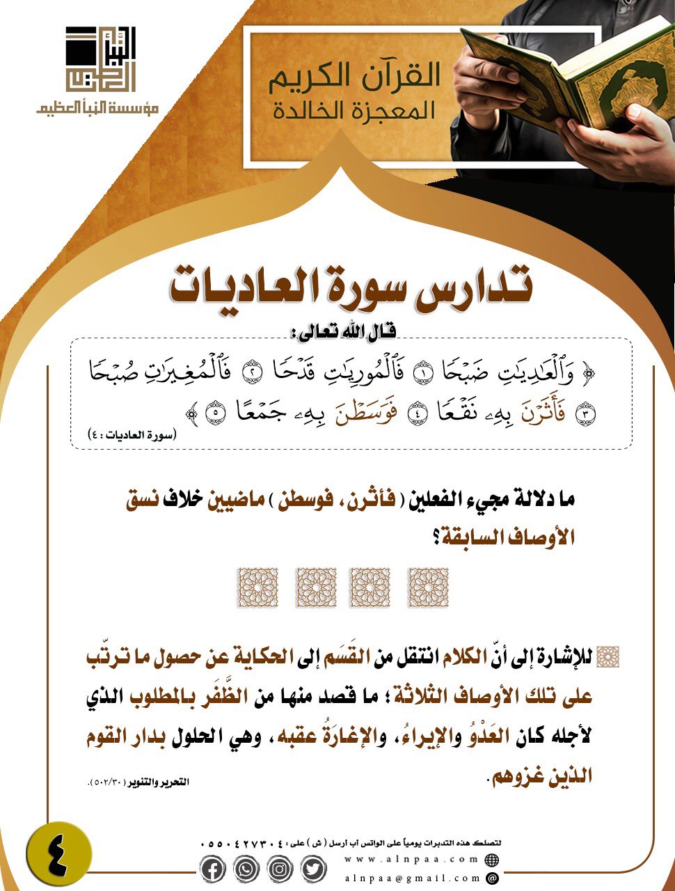 ▪️ التساؤل: قال الله تعالى: ﴿فَأَثَرْنَ بِهِ نَقْعًا • فَوَسَطْنَ بِهِ جَمْعًا﴾ ما دلالة مجيء الفعلين (فأثرن ، فوسطن) ماضيين خلاف نسق الأوصاف السابقة؟