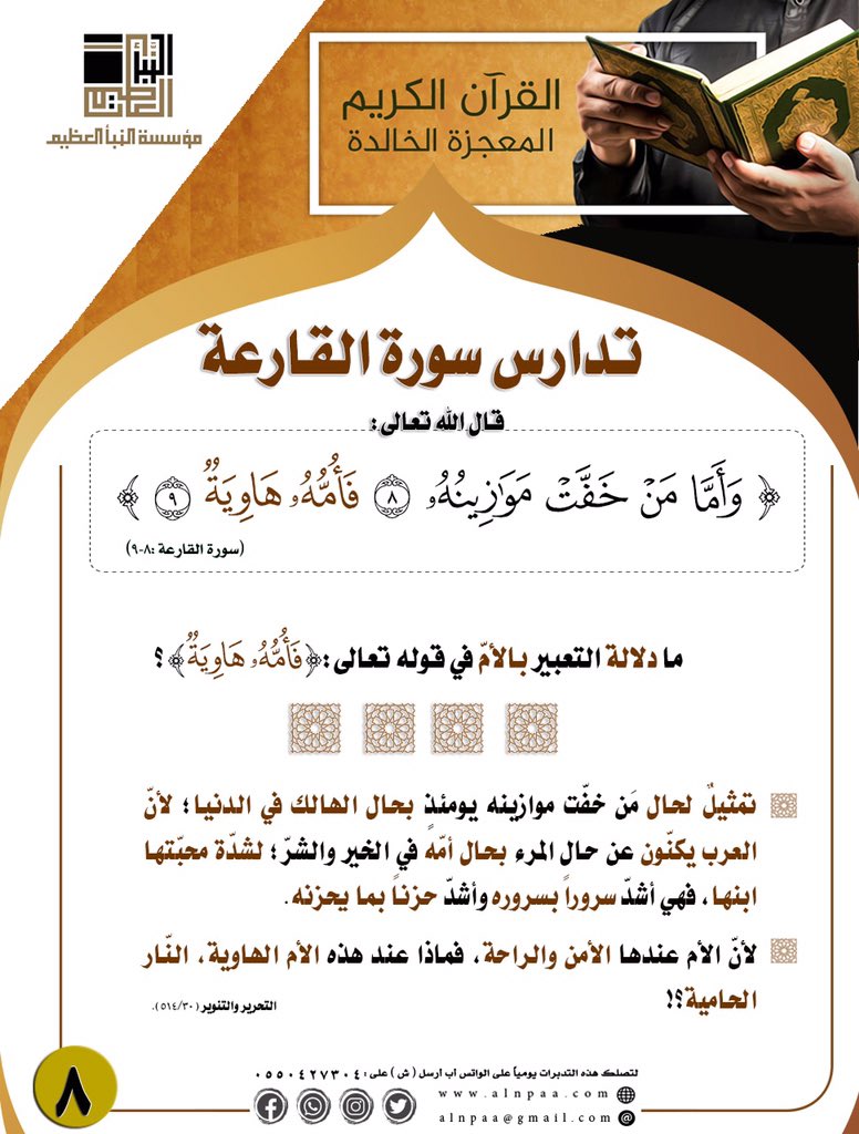 ▪️ التساؤل: قال الله تعالى: ﴿وَأَمَّا مَنْ خَفَّتْ مَوَازِينُهُ • فَأُمُّهُ هَاوِيَةٌ﴾ ما دلالة التعبير بالأم في قوله تعالى: (فَأُمُّهُ هَاوِيَةٌ)؟