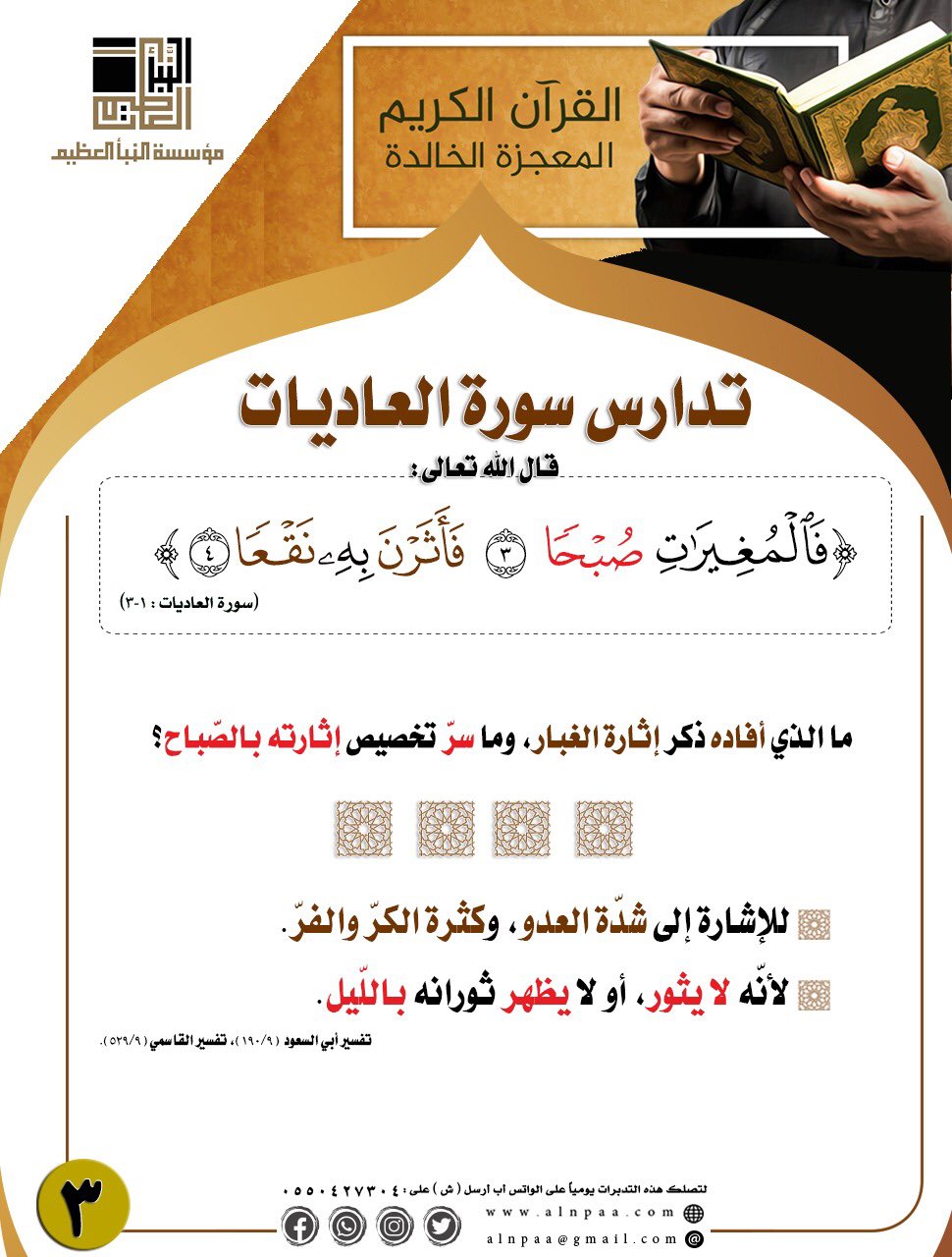 ▪️ التساؤل: قال الله تعالى: ﴿وَالْعَادِيَاتِ ضَبْحًا • فَأَثَرْنَ بِهِ نَقْعًا﴾ ما الذي أفاده ذكر إثارة الغبار، وما سرّ تخصيص إثارته بالصّباح؟