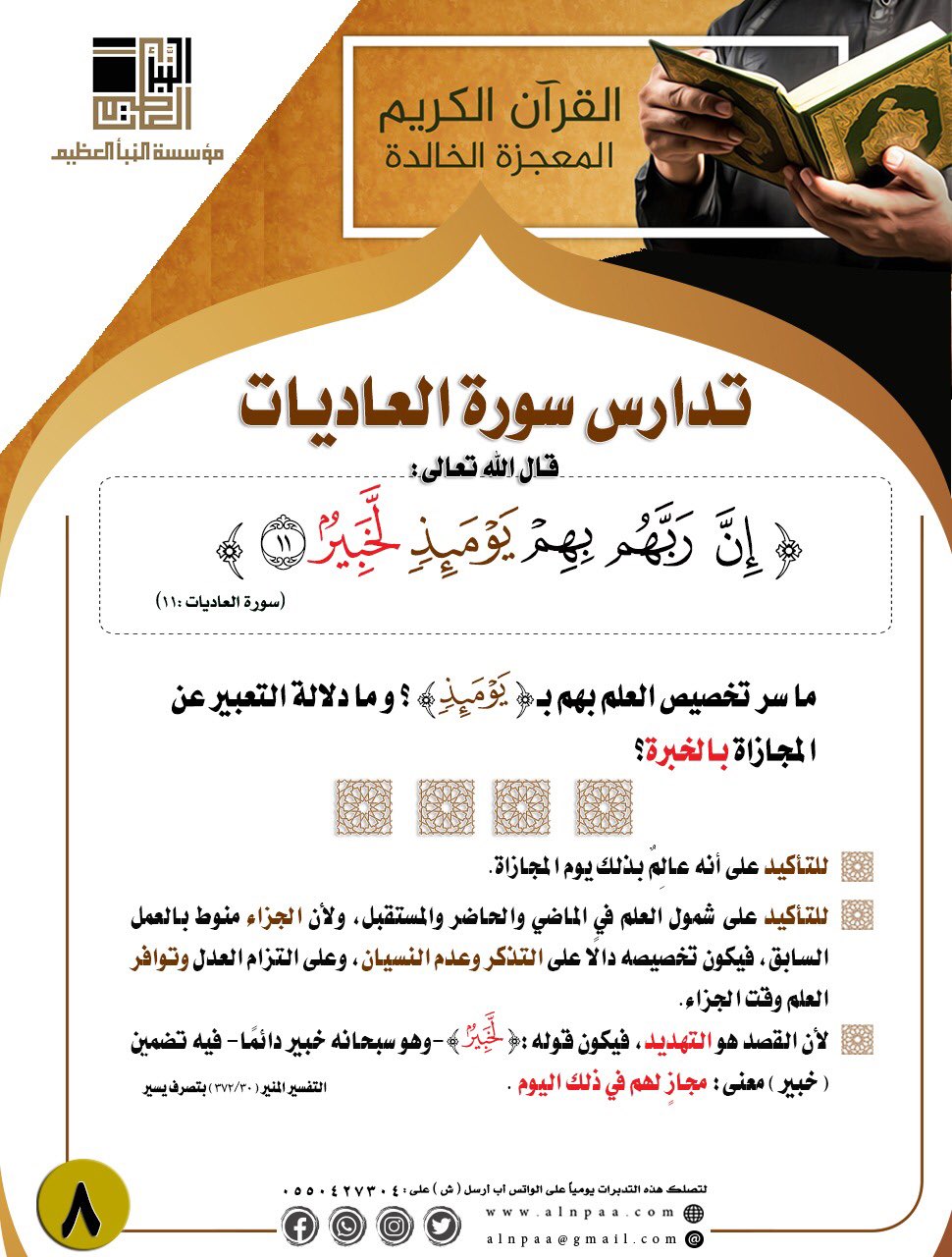 ▪️ التساؤل: قال الله تعالى: ﴿إِنَّ رَبَّهُم بِهِمْ يَوْمَئِذٍ لَّخَبِيرٌ﴾ ما سر تخصيص العلم بهم بـ (يَوْمَئِذٍ)؟ وما دلالة التعبير عن المجازاة بالخبرة؟