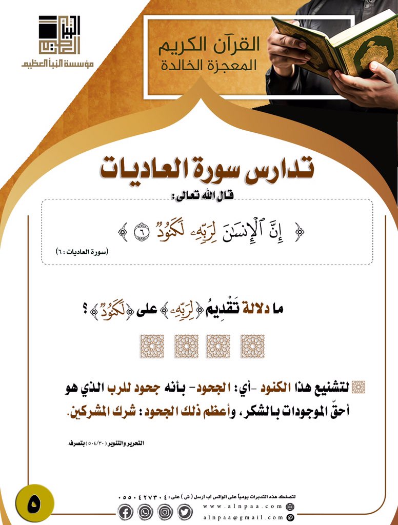 ▪️ التساؤل: قال الله تعالى: ﴿إِنَّ الْإِنسَانَ لِرَبِّهِ لَكَنُودٌ﴾ ما دلالة تَقْدِيمُ (لِرَبِّهِ) على (لَكَنُودٌ)؟