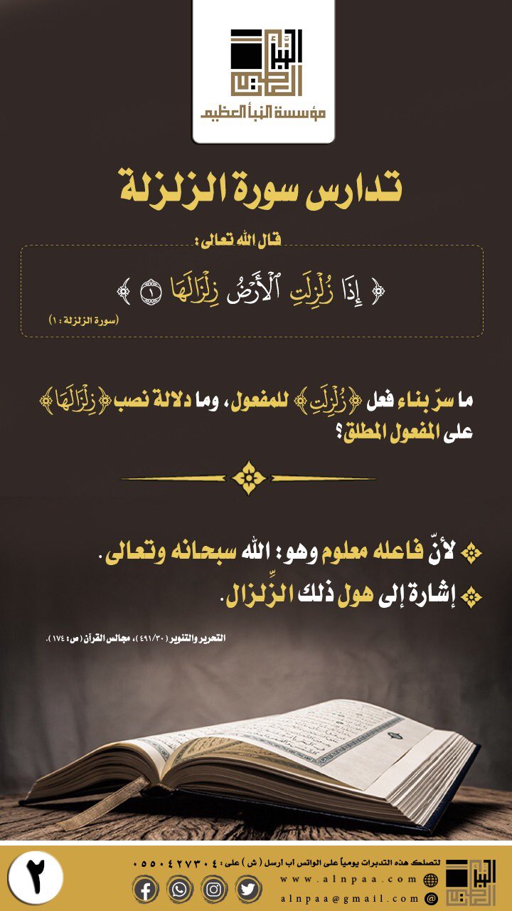 ▪️ التساؤل: قال الله تعالى: ﴿إِذَا زُلْزِلَتِ الْأَرْضُ زِلْزَالَهَا﴾ ما سرّ بناء فعل (زُلْزِلَتِ) للمفعول، وما دلالة نصب (زِلْزَالَهَا) على المفعول المطلق؟