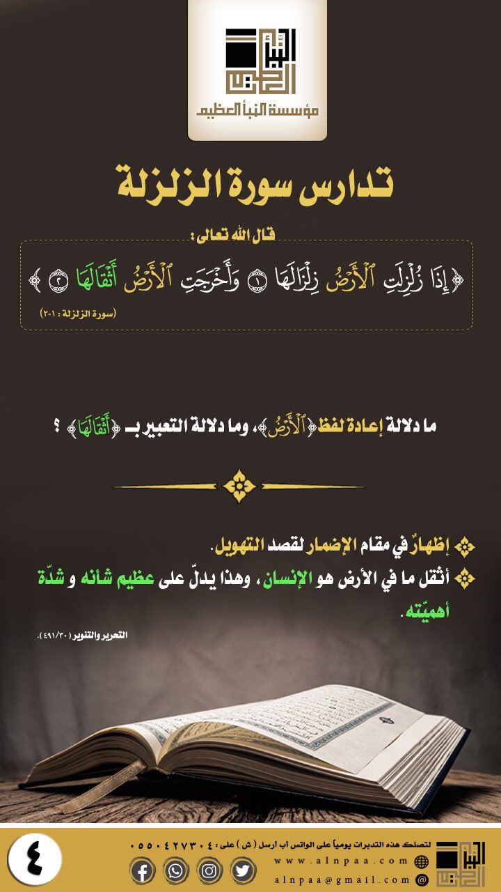 ▪️ التساؤل: قال الله تعالى: ﴿إِذَا زُلْزِلَتِ الْأَرْضُ زِلْزَالَهَا • وَأَخْرَجَتِ الْأَرْضُ أَثْقَالَهَا﴾ ما دلالة إعادة لفظ (الْأَرْضُ)، وما دلالة التعبير بـ (أَثْقَالَهَا)؟