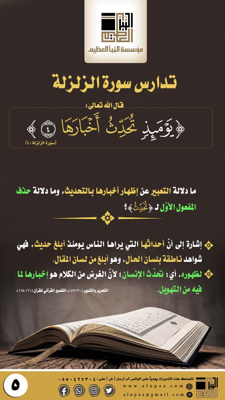 ▪️ التساؤل: قال الله تعالى: ﴿يَوْمَئِذٍ تُحَدِّثُ أَخْبَارَهَا﴾ ما دلالة التعبير عن إظهار أخبارها بالتحديث، وما دلالة حذف المفعول الأول لـ (تُحَدِّثُ)؟