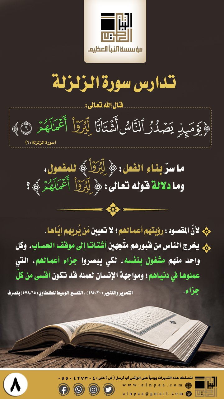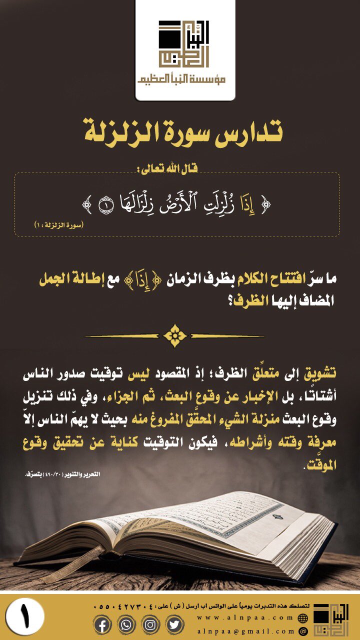 ▪️ التساؤل: قال الله تعالى: ﴿إِذَا زُلْزِلَتِ الْأَرْضُ زِلْزَالَهَا﴾ ما سرّ افتتاح الكلام بظرف الزمان (إِذَا) مع إطالة الجمل المضاف إليها الظرف؟