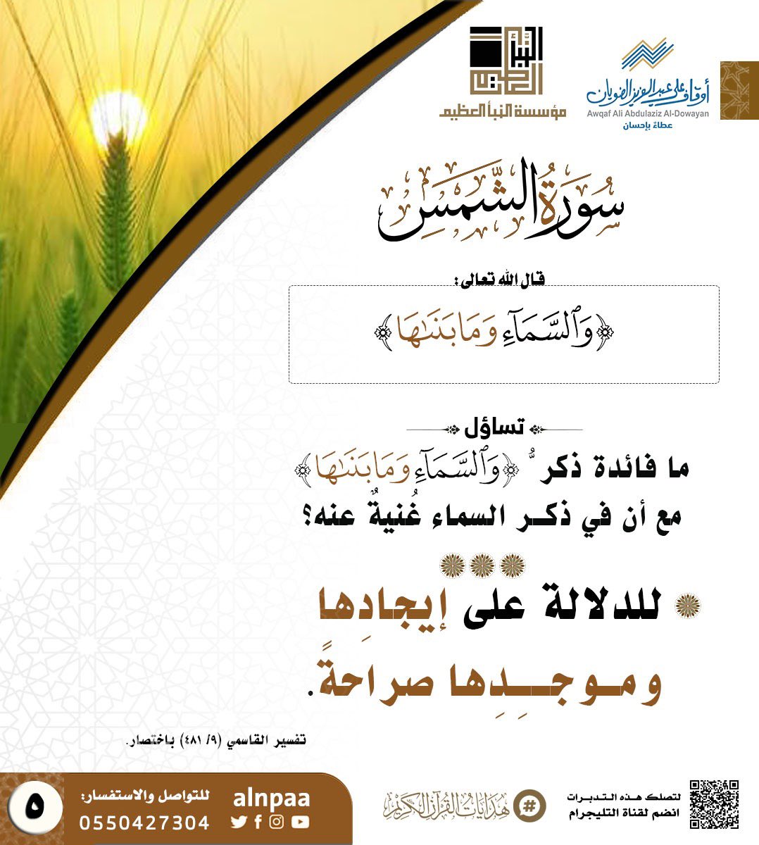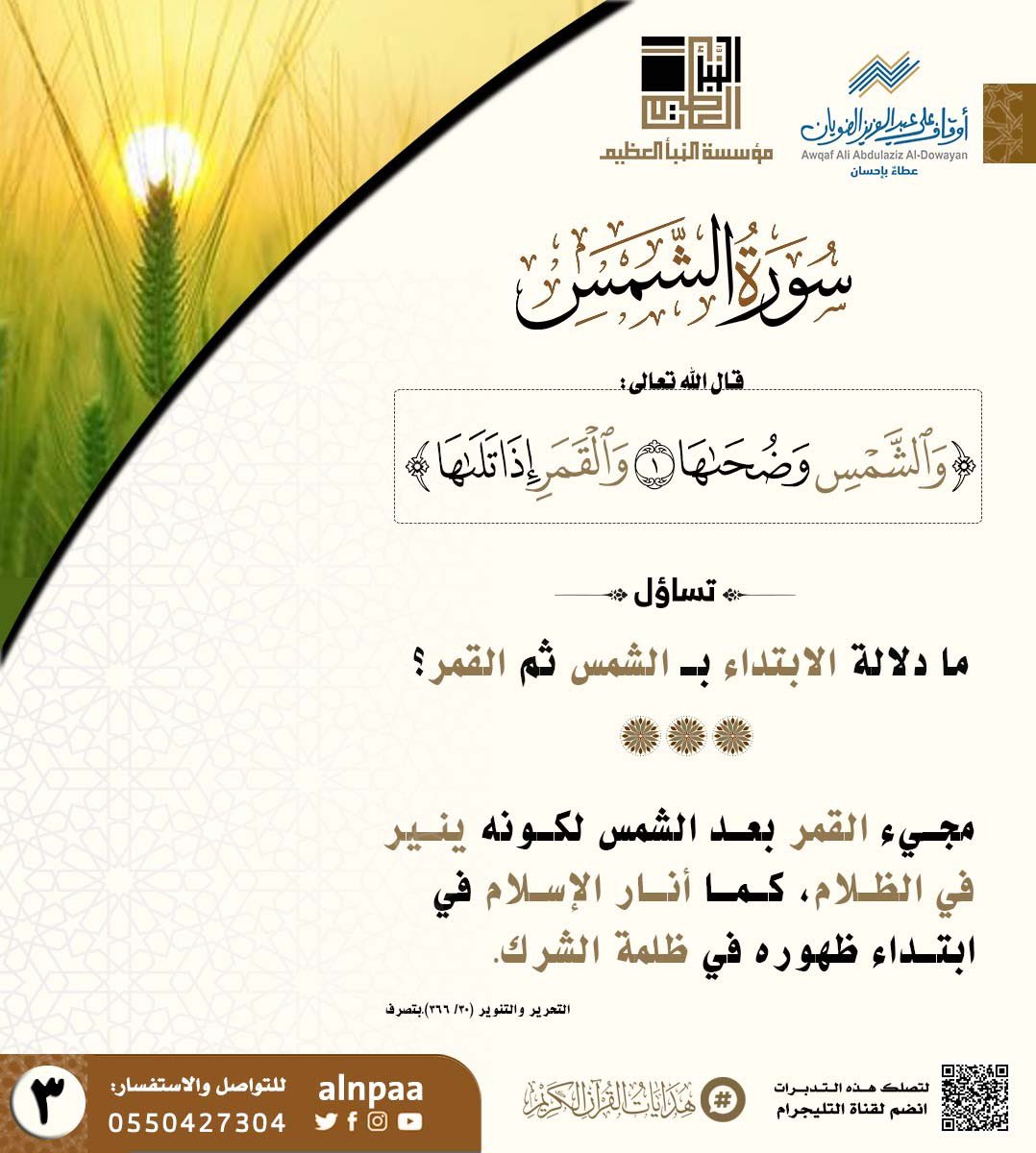▪️ التساؤل: قال الله تعالى: ﴿وَالشَّمْسِ وَضُحَاهَا • وَالْقَمَرِ إِذَا تَلَاهَا﴾ ما دلالة الابتداء بـ الشمس ثم القمـر؟