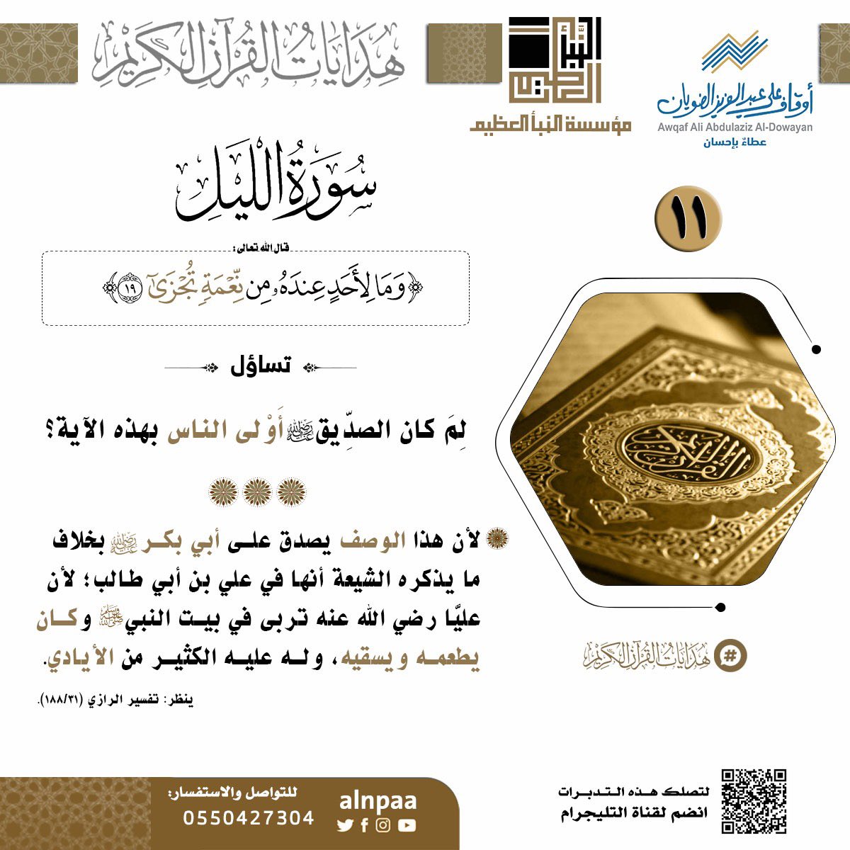 • التساؤل: قال الله تعالى: ﴿وَمَا لِأَحَدٍ عِندَهُ مِن نِّعْمَةٍ تُجْزَى﴾ لِمَ كان الصدِّيق (رضي الله عنه) أَوْلى الناس بهذه الآية؟