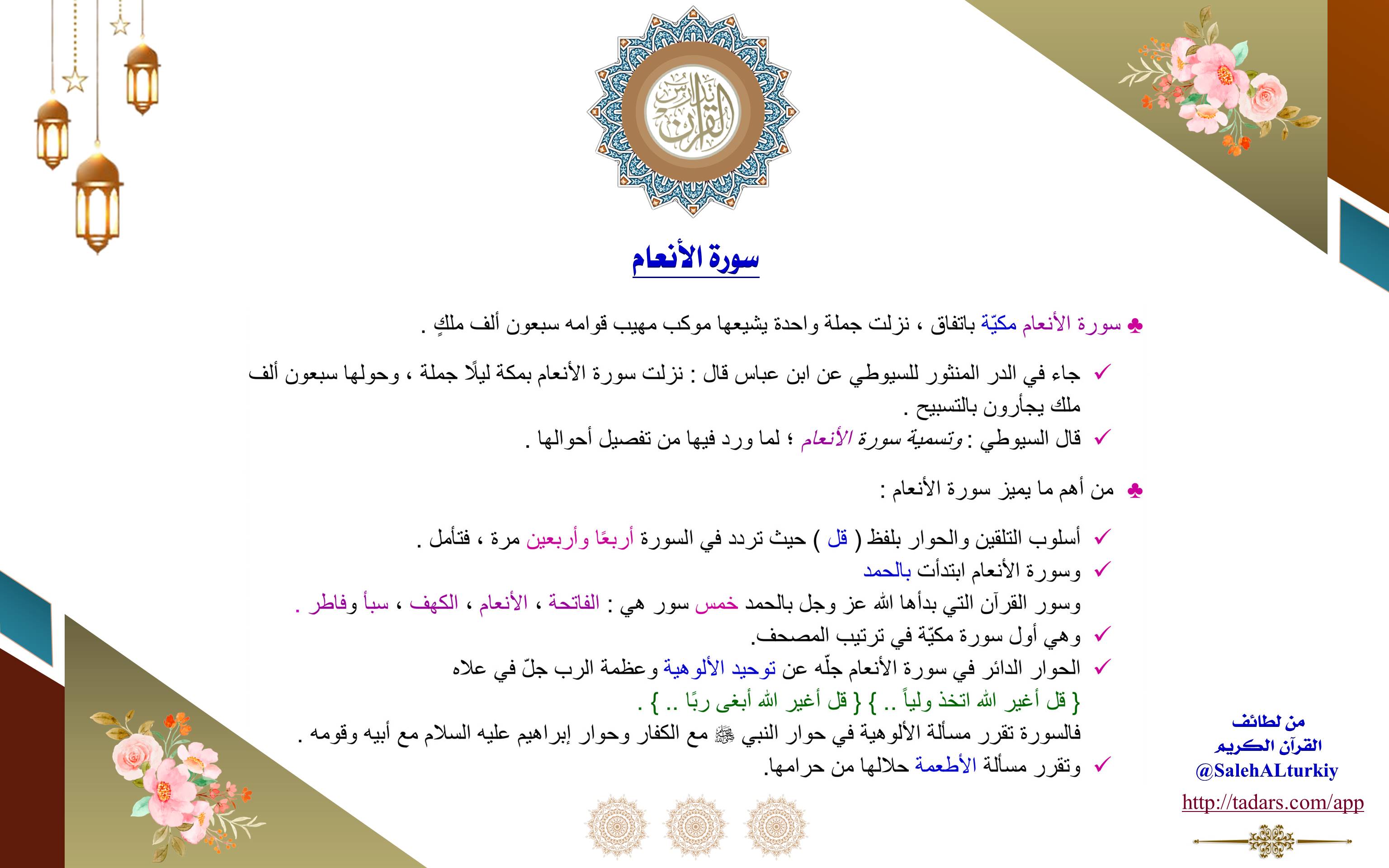 سورة الأنعام مكيّة باتفاق، نزلت جملة واحدة يشيعها موكب مهيب قوامه سبعون ألف ملكٍ.