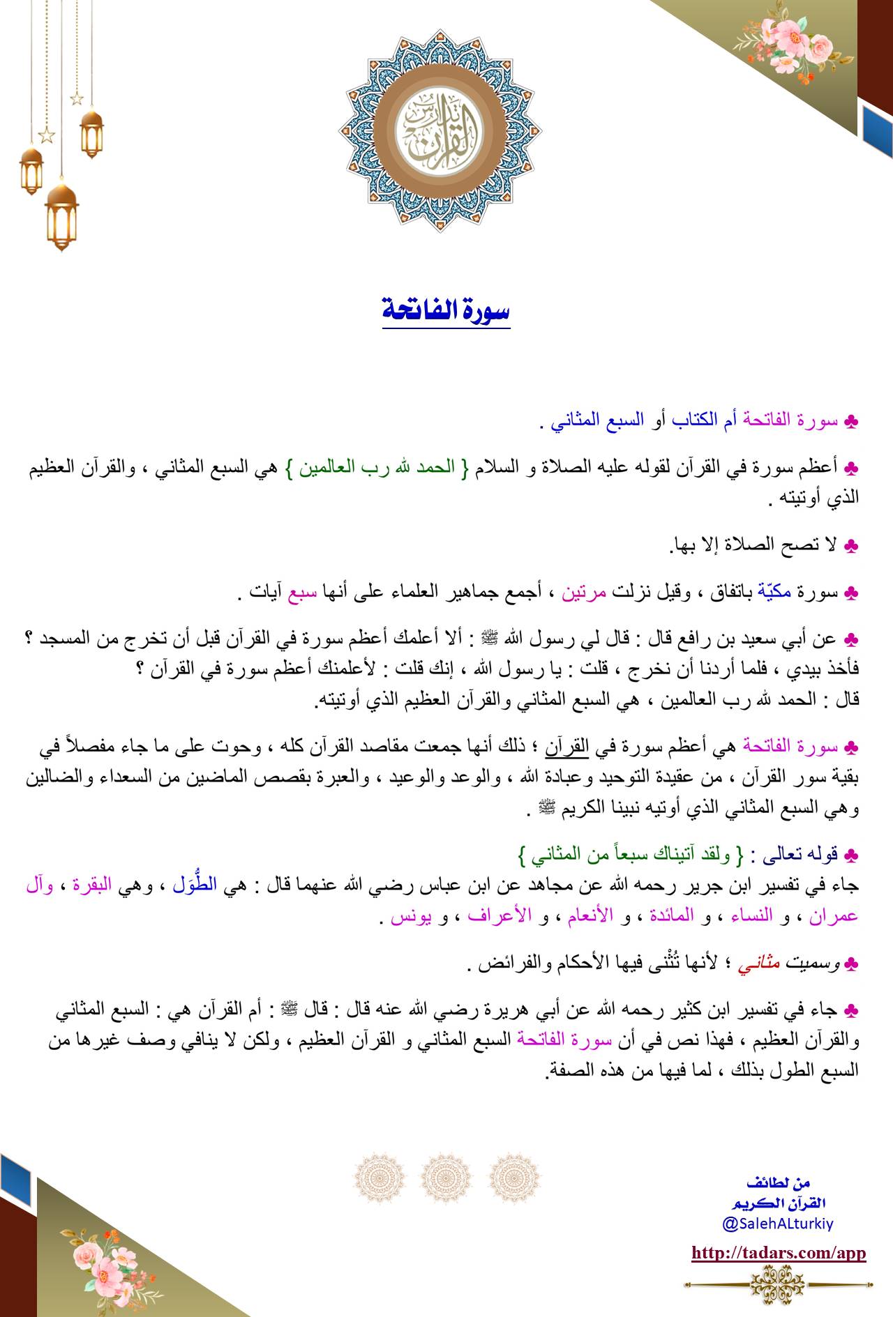 • سورة الفاتحة أم الكتاب أو السبع المثاني.
