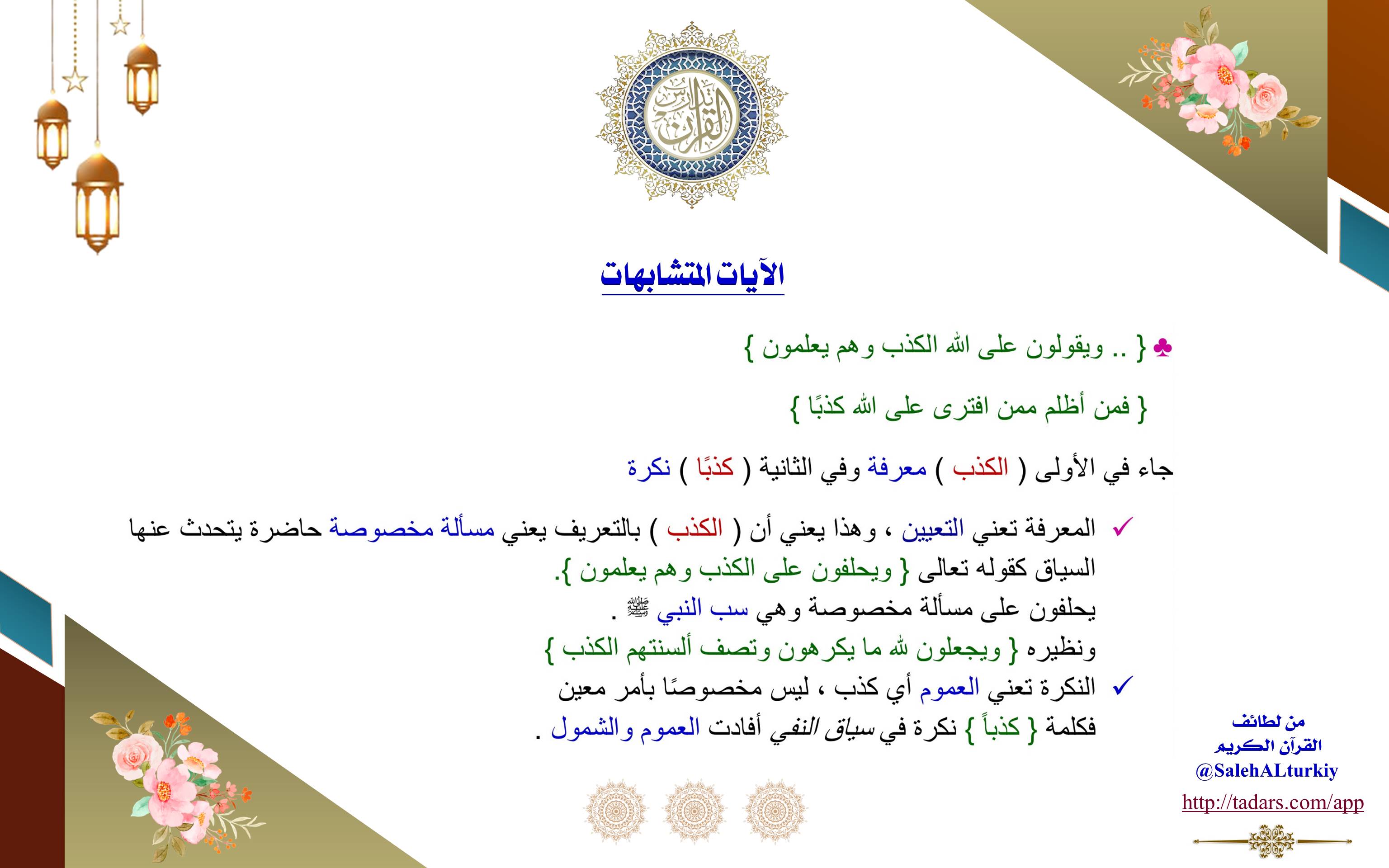 - المعرفة تعني التعيين، وهذا يعني أن (الكذب) بالتعريف يعني مسألة مخصوصة حاضرة يتحدث عنها السياق كقوله تعالى: {وَيَحْلِفُونَ عَلَى الْكَذِبِ وَهُمْ يَعْلَمُونَ}. يحلفون على مسألة مخصوصة وهي سب النبي (ﷺ) ونظيره {وَيَجْعَلُونَ لِلَّهِ مَا يَكْرَهُونَ وَتَصِفُ أَلْسِنَتُهُمُ الْكَذِبَ}.