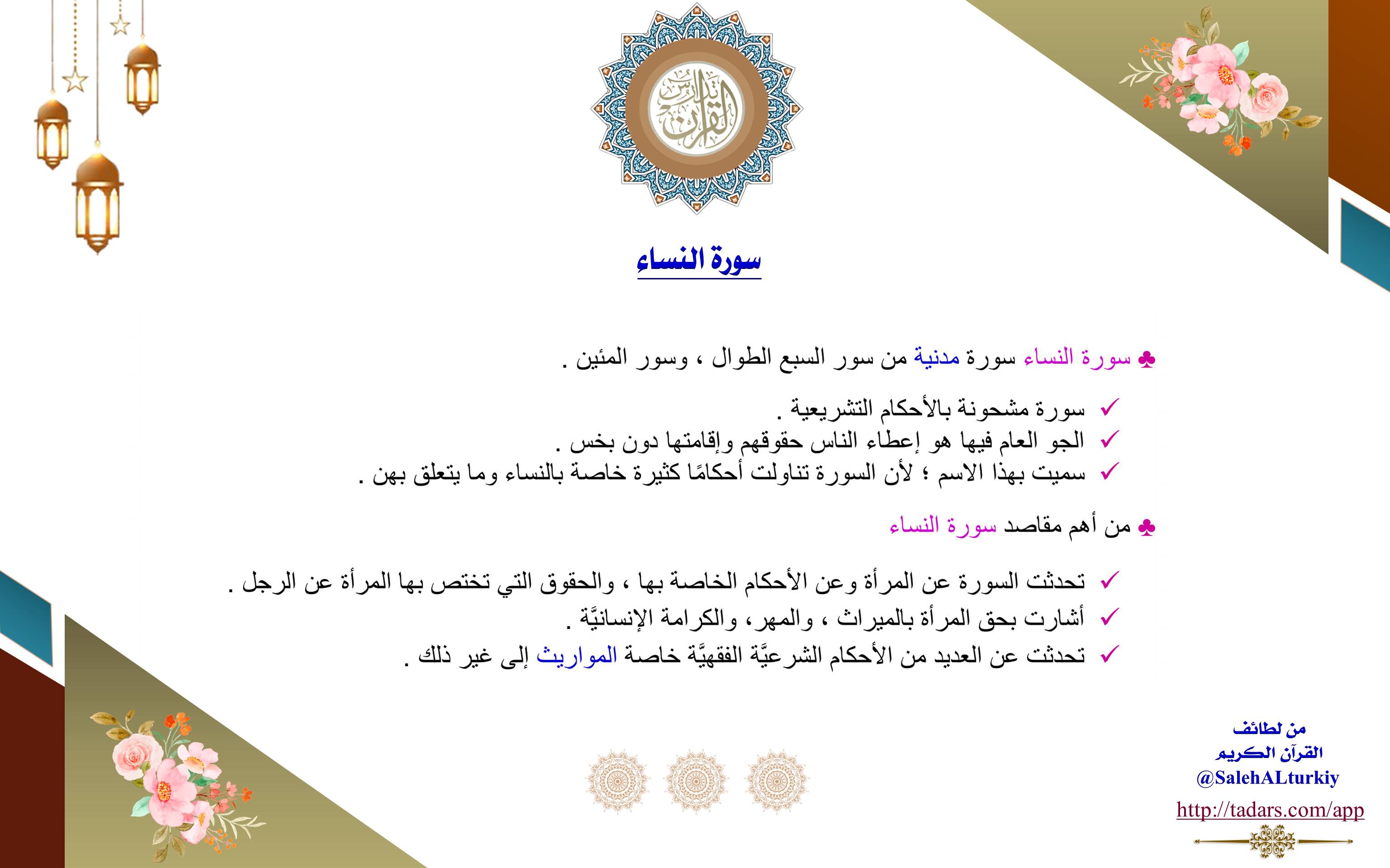 • سورة النساء سورة مدنية من سور السبع الطوال، وسور المئين.