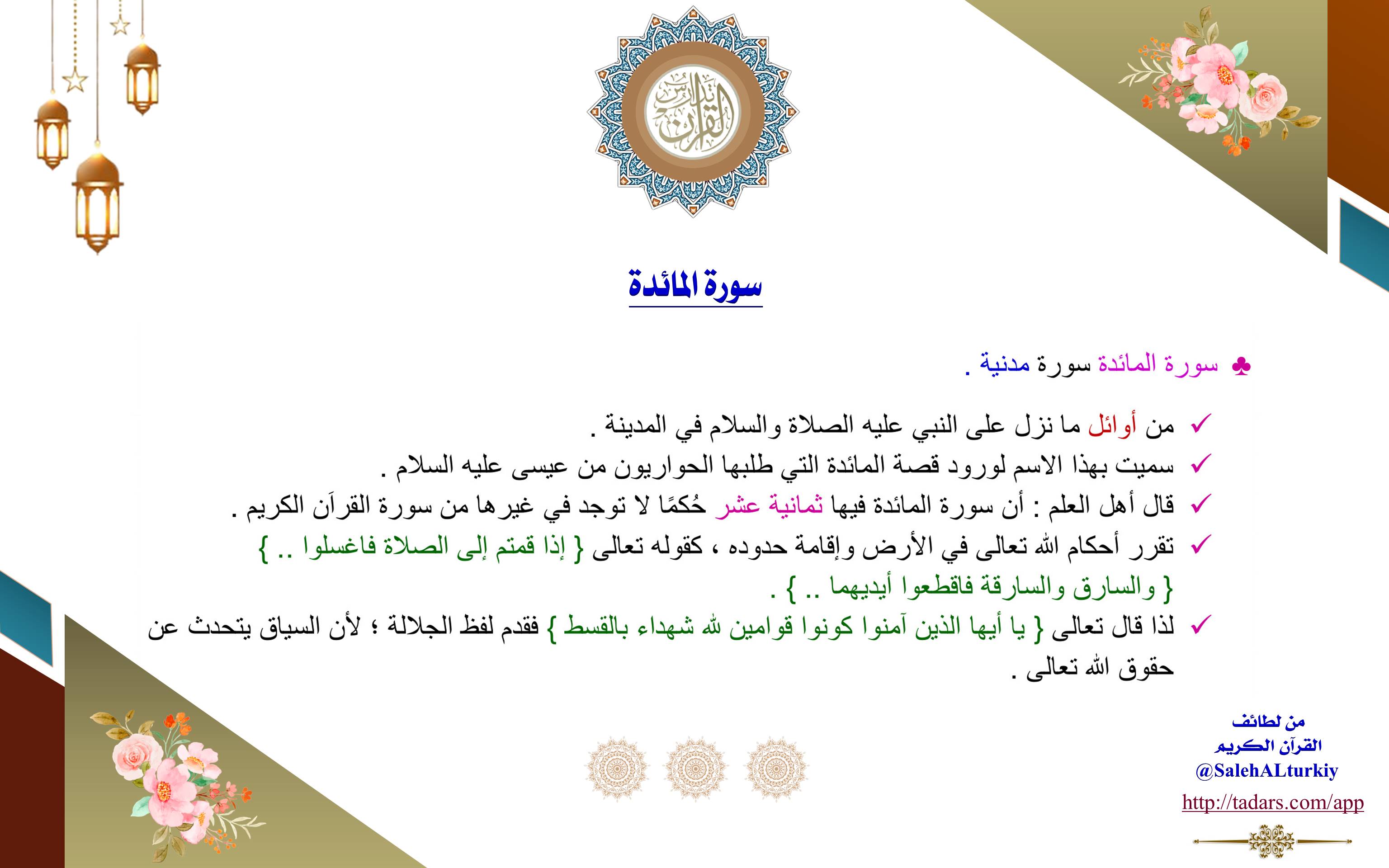 - قال أهل العلم: أن سورة المائدة فيها ثمانية عشر حُكمًا لا توجد في غيرها من سورة القرآن الكريم.