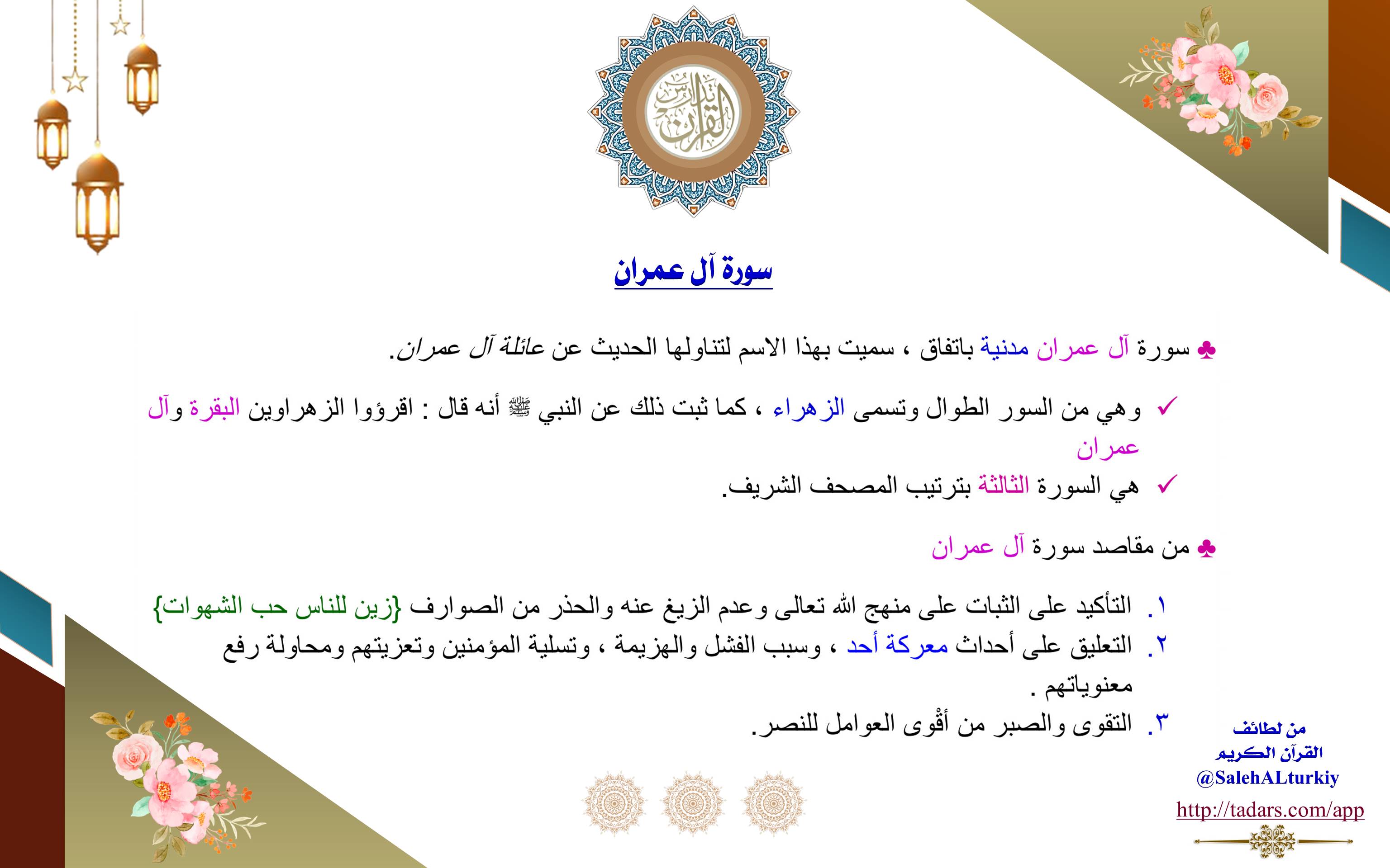 • سورة آل عمران مدنية باتفاق، سميت بهذا الاسم لتناولها الحديث عن عائلة آل عمران.