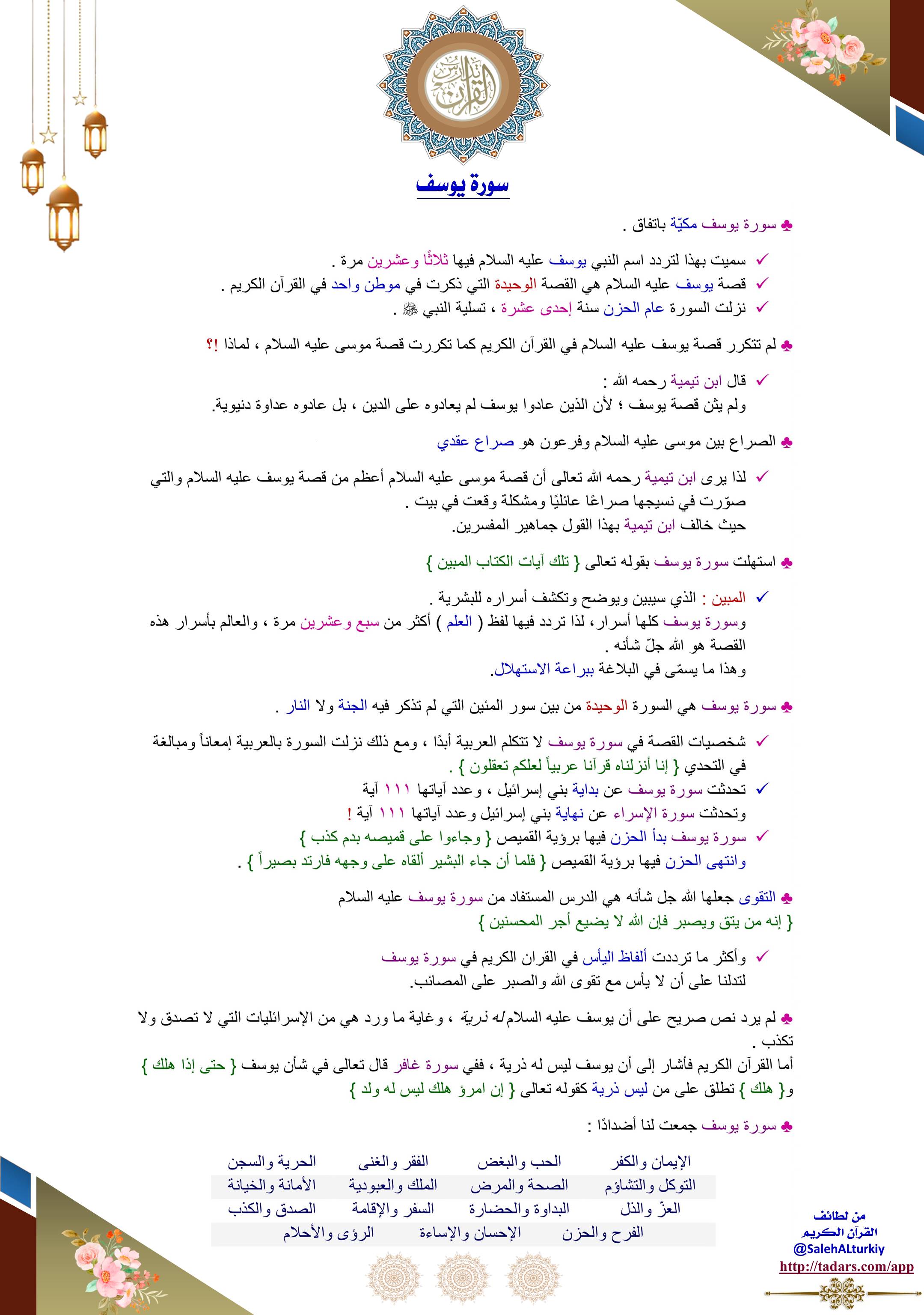 • سورة يوسف مكيّة باتفاق. سميت بهذا لتردد اسم النبي يوسف عليه السلام فيها ثلاثًا وعشرين مرة. قصة يوسف عليه السلام هي القصة الوحيدة التي ذكرت في موطن واحد في القرآن الكريم. نزلت السورة عام الحزن سنة إحدى عشرة، تسلية النبي (ﷺ).