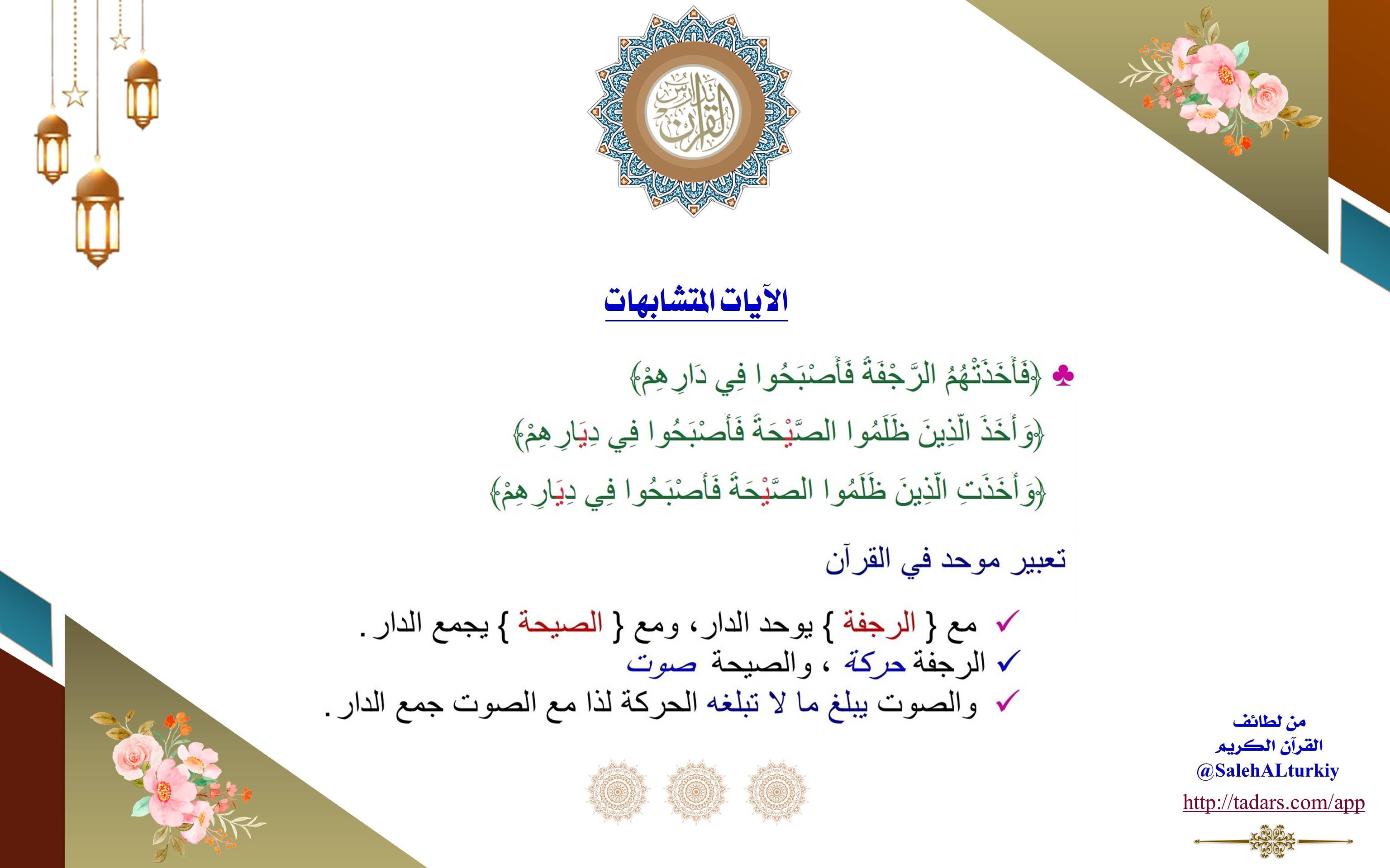 تعبير موحد في القرآن؛ مع {الرجفة} يوحد الدار، ومع {الصيحة} يجمع الدار. (الرجفة) حركة، و(الصيحة) صوت. والصوت يبلغ ما لا تبلغه الحركة لذا مع الصوت جمع الدار.
