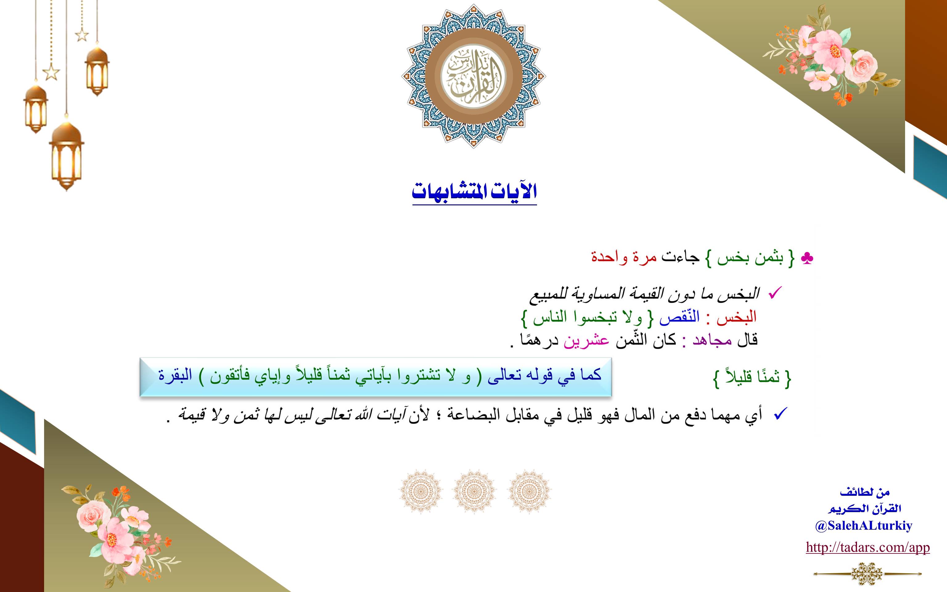 كما في قوله: (وَلَا تَشْتَرُوا بِآيَاتِي ثَمَنًا قَلِيلًا وَإِيَّايَ فَاتَّقُونِ) [البقرة] ، (اشْتَرَوْا بِآيَاتِ اللَّهِ ثَمَنًا قَلِيلًا فَصَدُّوا عَن سَبِيلِهِ إِنَّهُمْ سَاءَ مَا كَانُوا يَعْمَلُونَ) [التوبة].